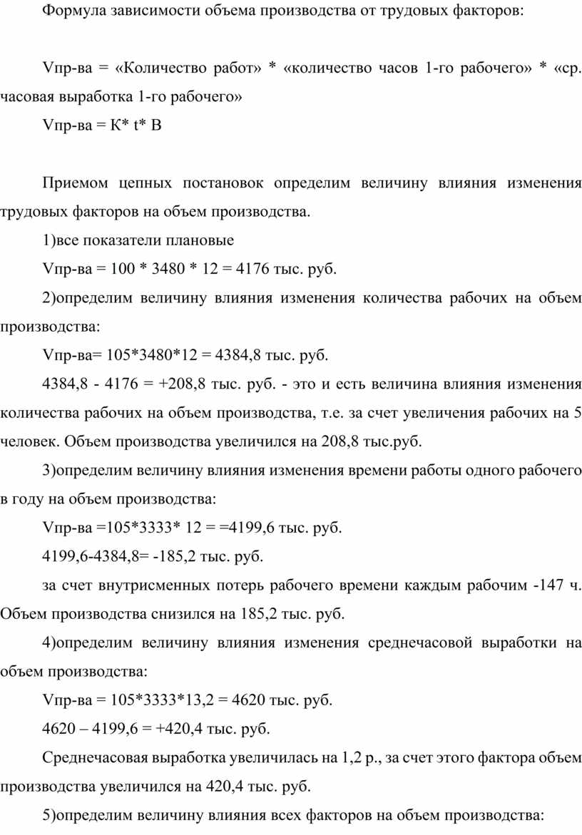 4384,8 - 4176 = +208,8 тыс. руб. - это и есть величина влияния изменения количества рабочих на объем производства, т.е. за счет увеличения рабочих на 5 человек. Объем производства увеличился на 208,8 тыс.руб.