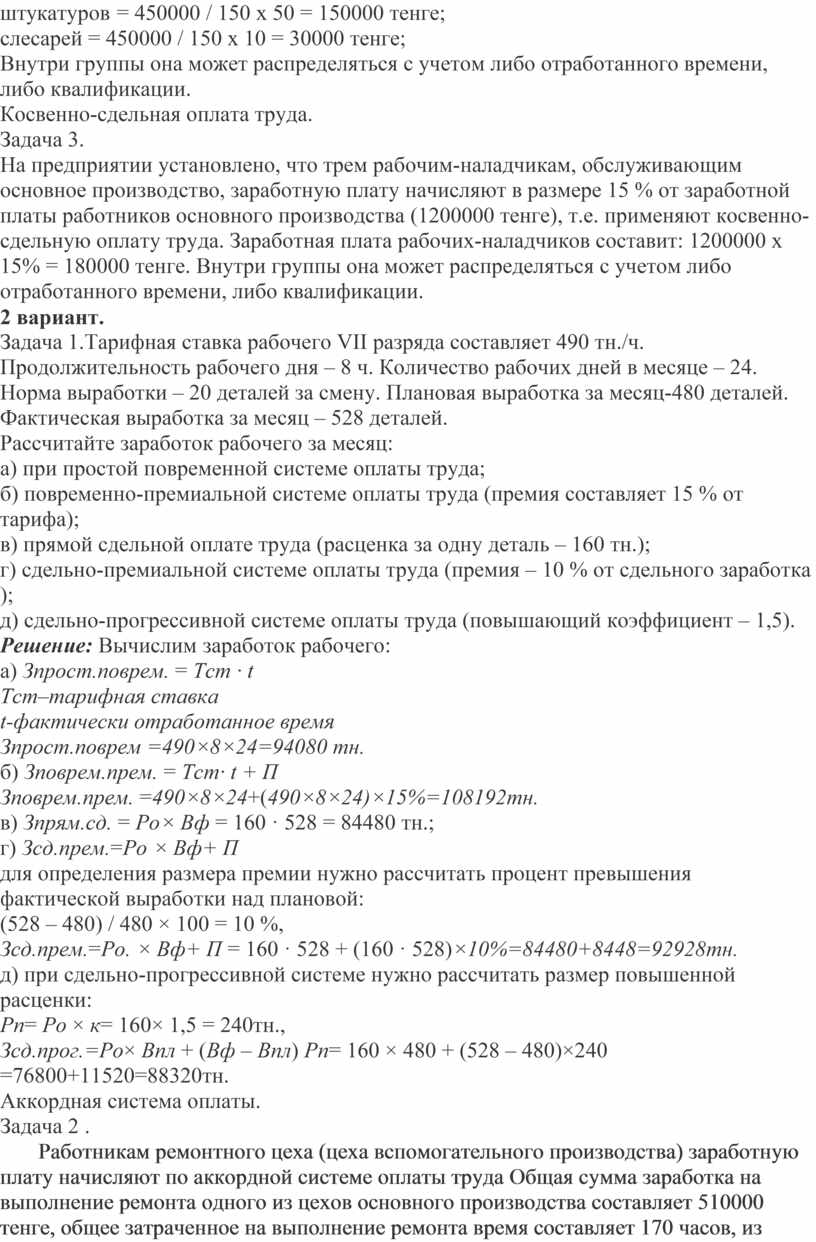 Задача 1.Тарифная ставка рабочего VII разряда составляет 490 тн./ч. Продолжительность рабочего дня – 8 ч. Количество рабочих дней в месяце – 24. Норма выработки – 20 деталей за смену. Плановая выработка за месяц-480 деталей. Фактическая выработка за месяц – 528 деталей.