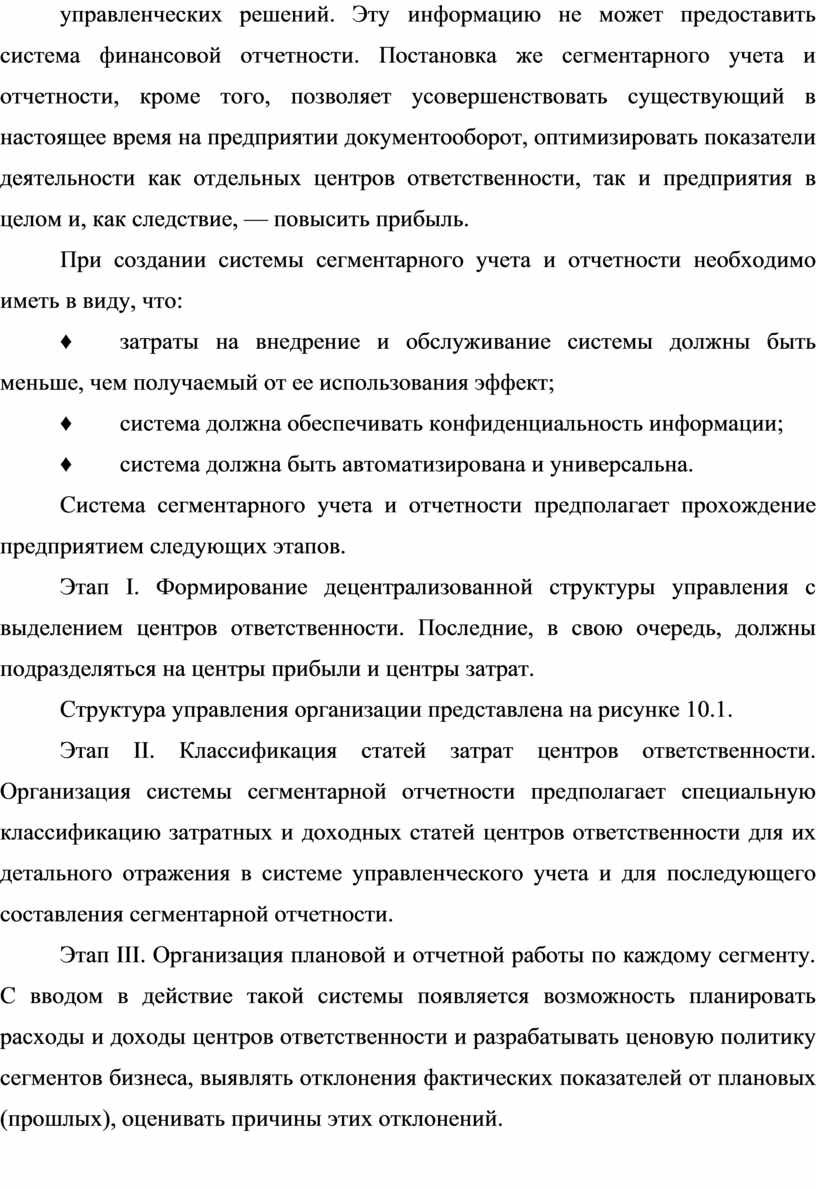Этап III. Организация плановой и отчетной работы по каждому сегменту. С вводом в действие такой системы появляется возможность планировать расходы и доходы центров ответственности и разрабатывать ценовую политику сегментов бизнеса, выявлять отклонения фактических показателей от плановых (прошлых), оценивать причины этих отклонений.