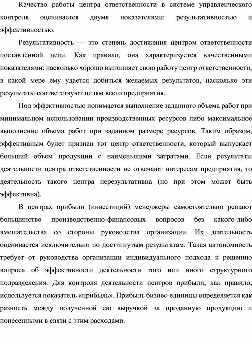 Качество работы центра ответственности в системе управленческого контроля оценивается двумя показателями: результативностью и эффективностью.