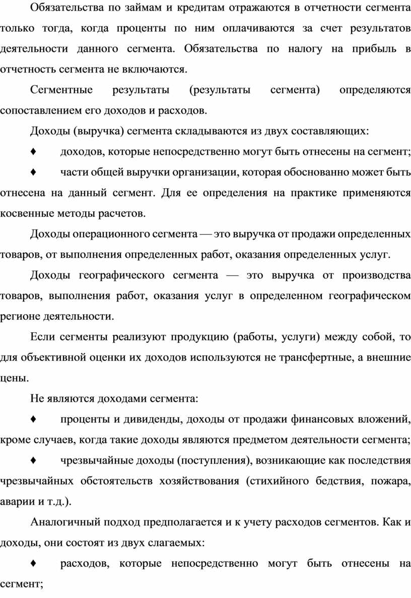 Обязательства сегмента состоят из кредиторской задолженности поставщикам, авансовых поступлений, начисленных обязательств. Обязательства по займам и кредитам отражаются в отчетности сегмента только тогда, когда проценты по ним оплачиваются за счет результатов деятельности данного сегмента. Обязательства по налогу на прибыль в отчетность сегмента не включаются.