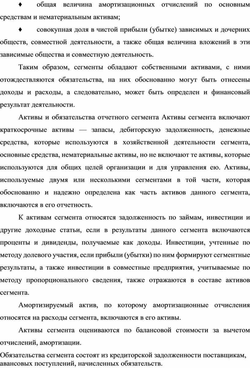 Активы и обязательства отчетного сегмента Активы сегмента включают краткосрочные активы — запасы, дебиторскую задолженность, денежные средства, которые используются в хозяйственной деятельности сегмента, основные средства, нематериальные активы, но не включают те активы, которые используются для общих целей организации и для управления ею. Активы, используемые двумя или несколькими сегментами в той части, которая обоснованно и надежно определена как часть активов данного сегмента, включаются в его отчетность.
