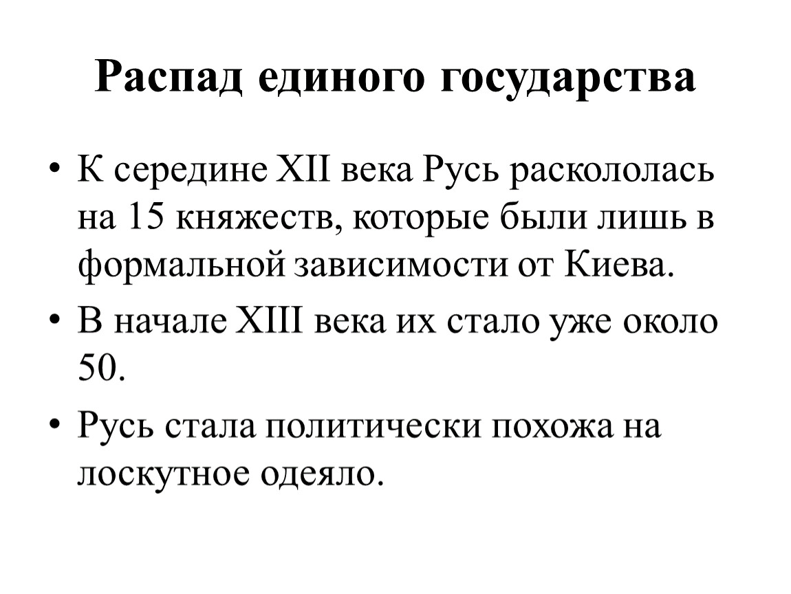 К середине XII века Русь раскололась на 15 княжеств, которые были лишь в формальной зависимости от Киева.