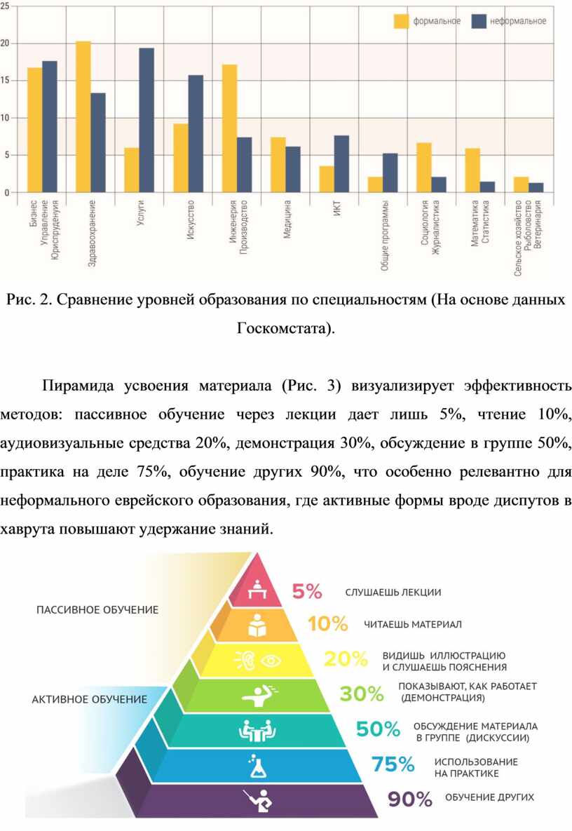 Пирамида усвоения материала (Рис. 3) визуализирует эффективность методов: пассивное обучение через лекции дает лишь 5%, чтение 10%, аудиовизуальные средства 20%, демонстрация 30%, обсуждение в группе 50%, практика на деле 75%, обучение других 90%, что особенно релевантно для неформального еврейского образования, где активные формы вроде диспутов в хаврута повышают удержание знаний.