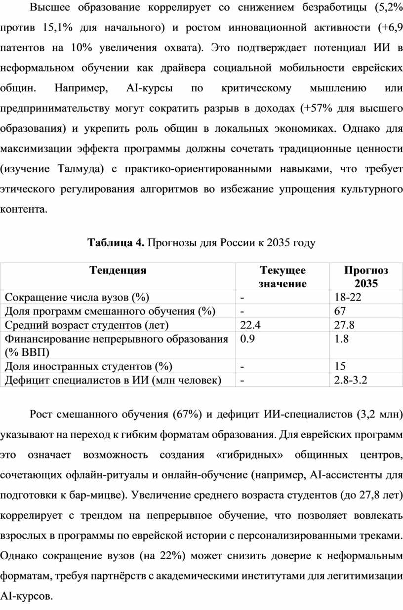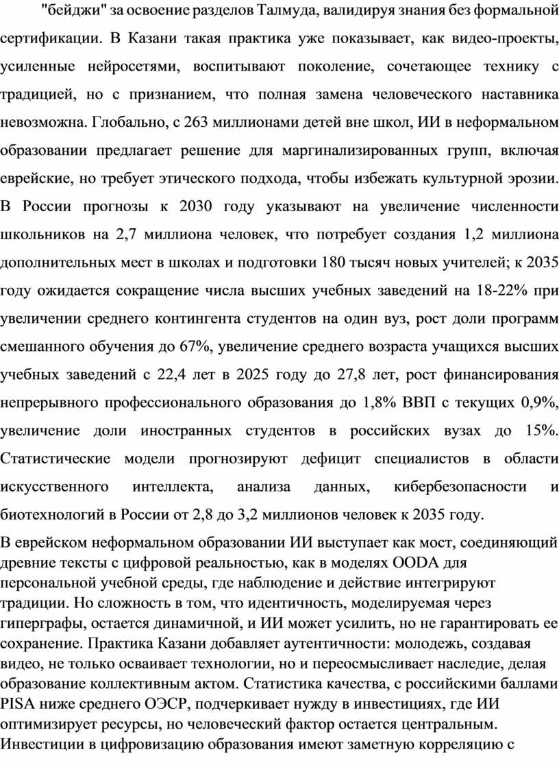 Прогнозная аналитика указывает на рост микроквалификаций на 340% к 2035 году, что применимо к неформальному еврейскому: ИИ может выдавать "бейджи" за освоение разделов Талмуда, валидируя знания без формальной сертификации. В Казани такая практика уже показывает, как видео-проекты, усиленные нейросетями, воспитывают поколение, сочетающее технику с традицией, но с признанием, что полная замена человеческого наставника невозможна. Глобально, с 263 миллионами детей вне школ, ИИ в неформальном образовании предлагает решение для маргинализированных групп, включая еврейские, но требует этического подхода, чтобы избежать культурной эрозии. В России прогнозы к 2030 году указывают на увеличение численности школьников на 2,7 миллиона человек, что потребует создания 1,2 миллиона дополнительных мест в школах и подготовки 180 тысяч новых учителей; к 2035 году ожидается сокращение числа высших учебных заведений на 18-22% при увеличении среднего контингента студентов на один вуз, рост доли программ смешанного обучения до 67%, увеличение среднего возраста учащихся высших учебных заведений с 22,4 лет в 2025 году до 27,8 лет, рост финансирования непрерывного профессионального образования до 1,8% ВВП с текущих 0,9%, увеличение доли иностранных студентов в российских вузах до 15%. Статистические модели прогнозируют дефицит специалистов в области искусственного интеллекта, анализа данных, кибербезопасности и биотехнологий в России от 2,8 до 3,2 миллионов человек к 2035 году.