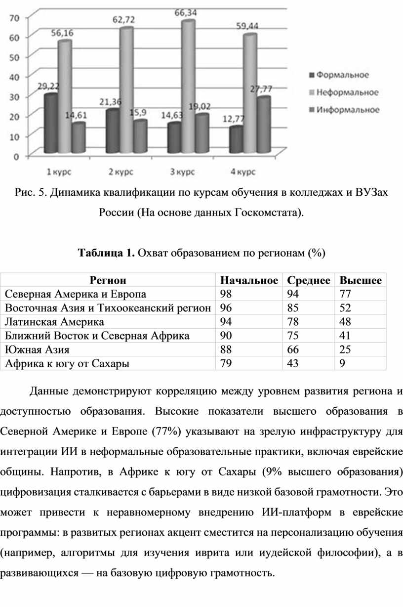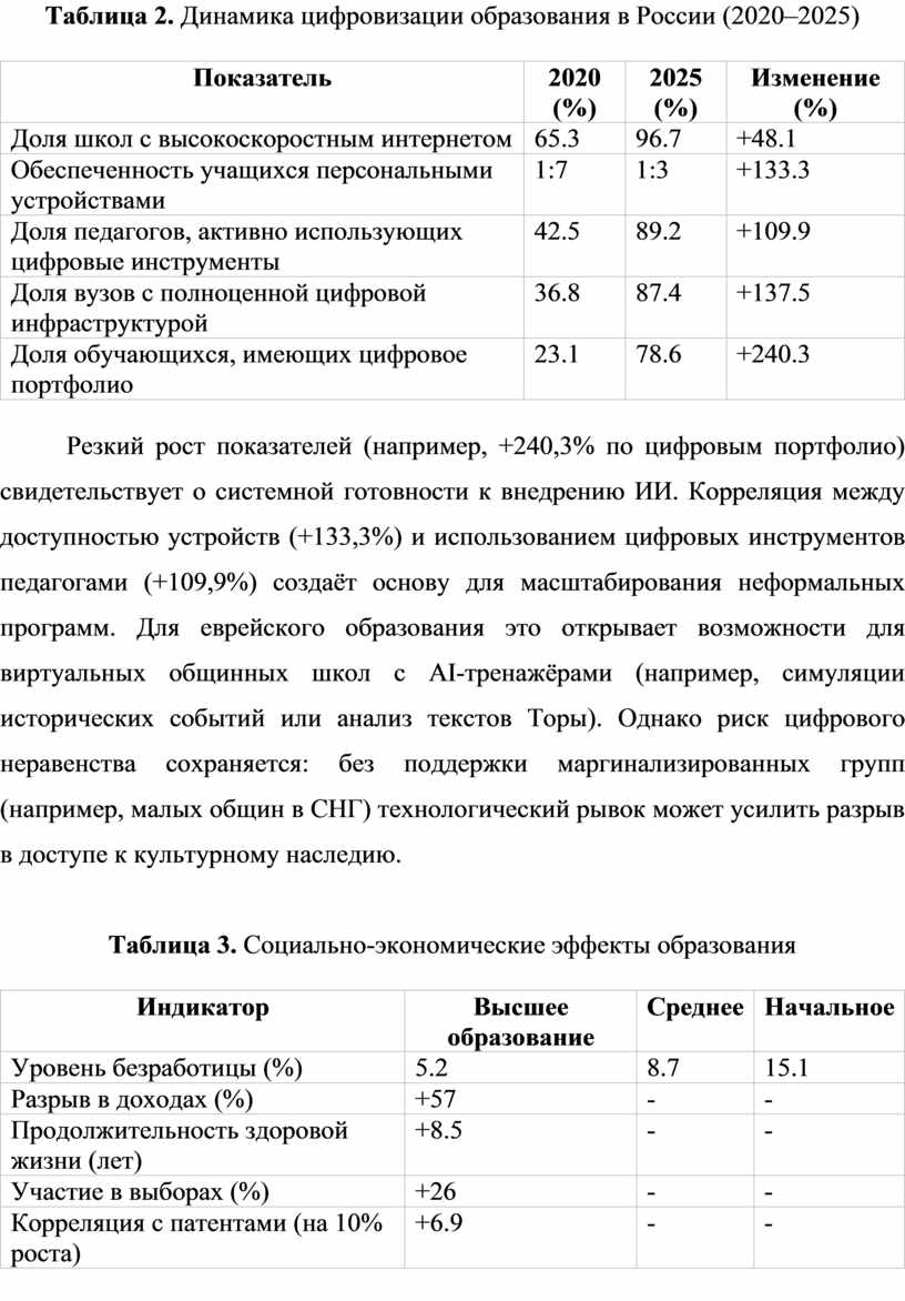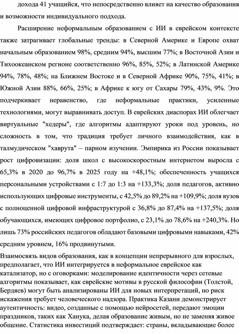 Расширение неформальным образованием с ИИ в еврейском контексте также затрагивает глобальные тренды: в Северной Америке и Европе охват начальным образованием 98%, средним 94%, высшим 77%; в Восточной Азии и Тихоокеанском регионе соответственно 96%, 85%, 52%; в Латинской Америке 94%, 78%, 48%; на Ближнем Востоке и в Северной Африке 90%, 75%, 41%; в Южной Азии 88%, 66%, 25%; в Африке к югу от Сахары 79%, 43%, 9%. Это подчеркивает неравенство, где неформальные практики, усиленные технологиями, могут выравнивать доступ. В еврейских диаспорах ИИ облегчает виртуальные "хедеры", где алгоритмы адаптируют уроки под уровень, но сложность в том, что традиция требует личного взаимодействия, как в талмудическом "хаврута" – парном изучении. Эмпирика из России показывает рост цифровизации: доля школ с высокоскоростным интернетом выросла с 65,3% в 2020 до 96,7% в 2025 году на +48,1%; обеспеченность учащихся персональными устройствами с 1:7 до 1:3 на +133,3%; доля педагогов, активно использующих цифровые инструменты, с 42,5% до 89,2% на +109,9%; доля вузов с полноценной цифровой инфраструктурой с 36,8% до 87,4% на +137,5%; доля обучающихся, имеющих цифровое портфолио, с 23,1% до 78,6% на +240,3%. Но лишь 73% российских педагогов обладают базовыми цифровыми навыками, 42% средним уровнем, 16% продвинутыми.