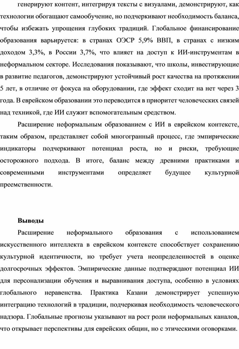 Расширение неформального образования с использованием искусственного интеллекта в еврейском контексте способствует сохранению культурной идентичности, но требует учета неопределенностей в оценке долгосрочных эффектов. Эмпирические данные подтверждают потенциал ИИ для персонализации обучения и выравнивания доступа, особенно в условиях глобального неравенства. Практика Казани демонстрирует успешную интеграцию технологий в традиции, подчеркивая необходимость человеческого надзора. Глобальные прогнозы указывают на рост роли неформальных каналов, что открывает перспективы для еврейских общин, но с этическими оговорками.