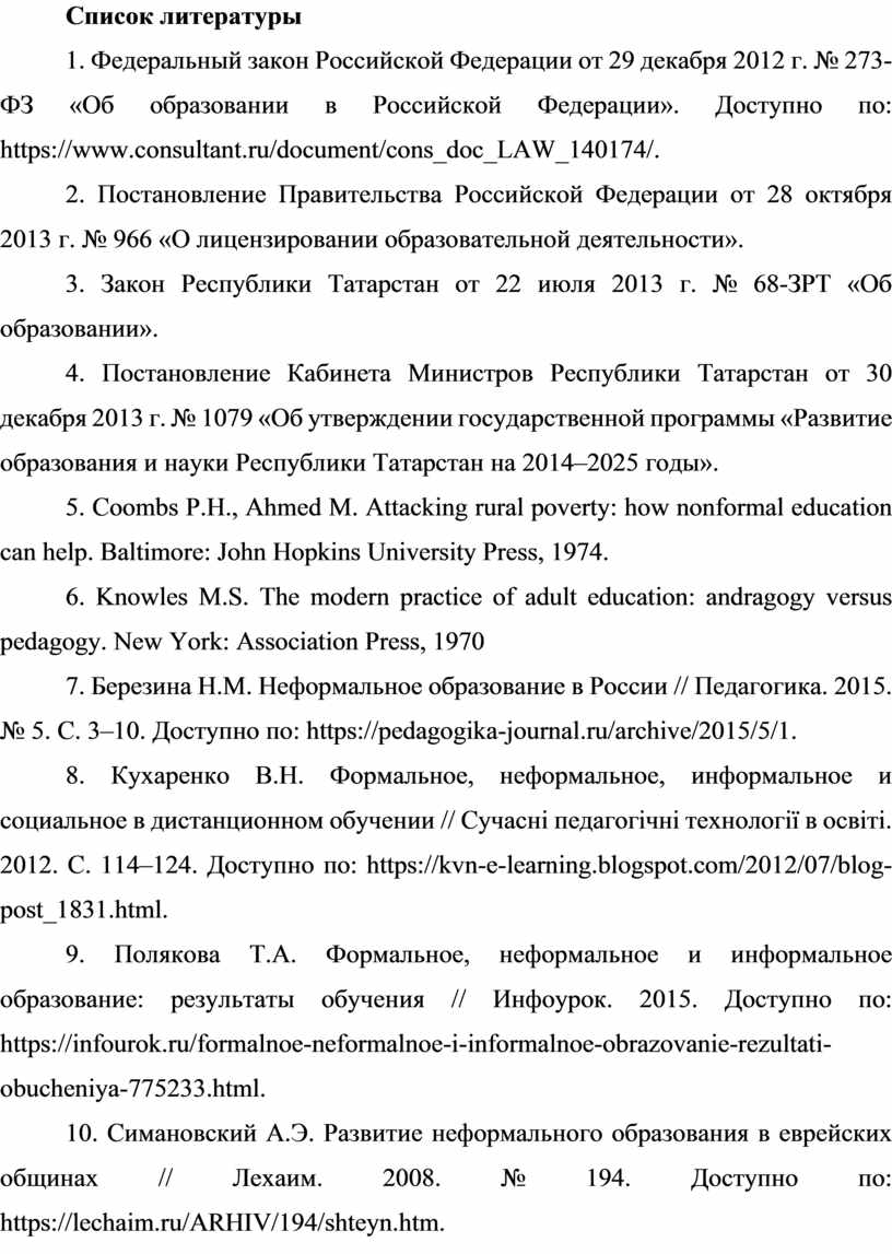 9. Полякова Т.А. Формальное, неформальное и информальное образование: результаты обучения // Инфоурок. 2015. Доступно по: https://infourok.ru/formalnoe-neformalnoe-i-informalnoe-obrazovanie-rezultati-obucheniya-775233.html.