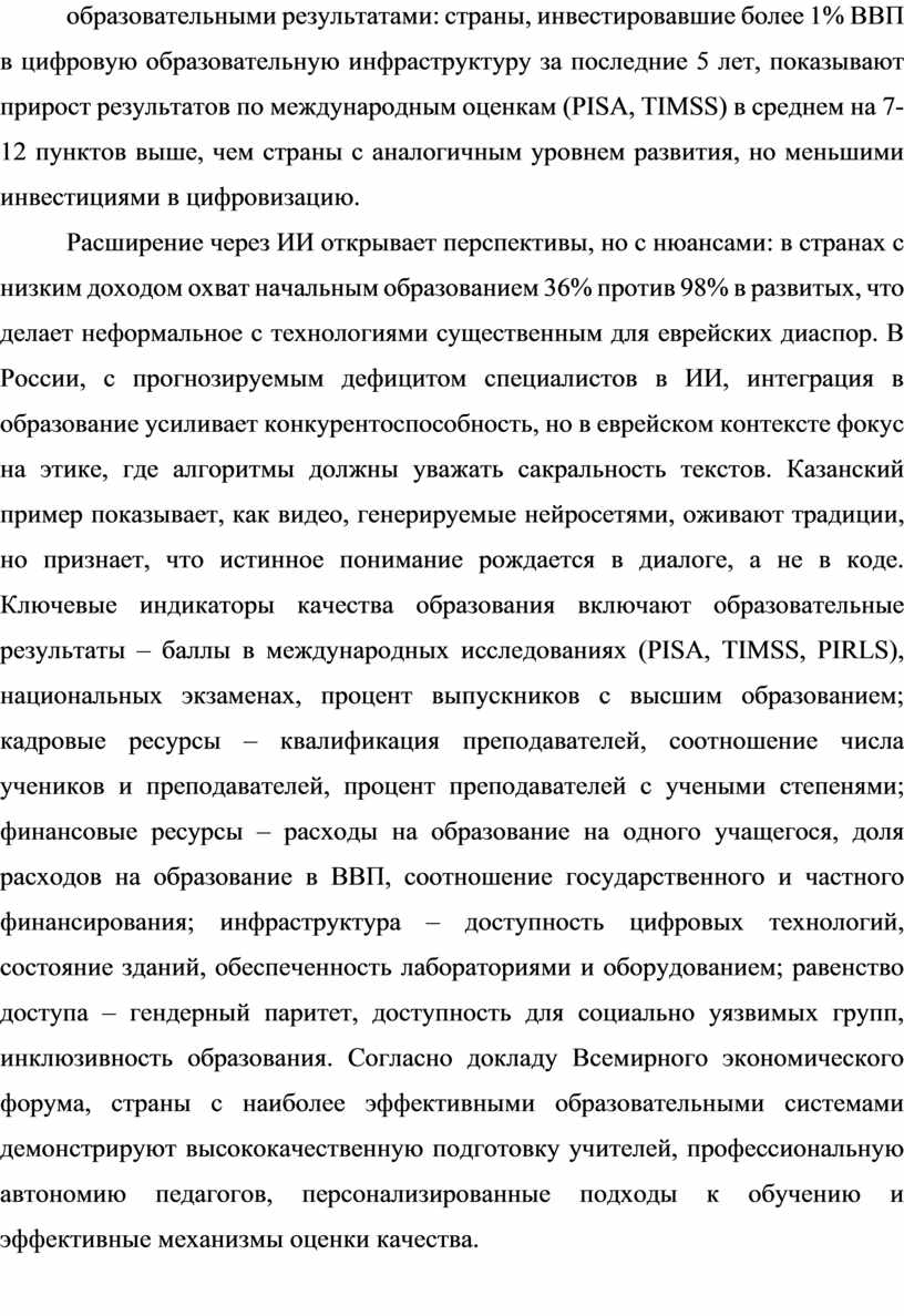 Расширение через ИИ открывает перспективы, но с нюансами: в странах с низким доходом охват начальным образованием 36% против 98% в развитых, что делает неформальное с технологиями существенным для еврейских диаспор. В России, с прогнозируемым дефицитом специалистов в ИИ, интеграция в образование усиливает конкурентоспособность, но в еврейском контексте фокус на этике, где алгоритмы должны уважать сакральность текстов. Казанский пример показывает, как видео, генерируемые нейросетями, оживают традиции, но признает, что истинное понимание рождается в диалоге, а не в коде. Ключевые индикаторы качества образования включают образовательные результаты – баллы в международных исследованиях (PISA, TIMSS, PIRLS), национальных экзаменах, процент выпускников с высшим образованием; кадровые ресурсы – квалификация преподавателей, соотношение числа учеников и преподавателей, процент преподавателей с учеными степенями; финансовые ресурсы – расходы на образование на одного учащегося, доля расходов на образование в ВВП, соотношение государственного и частного финансирования; инфраструктура – доступность цифровых технологий, состояние зданий, обеспеченность лабораториями и оборудованием; равенство доступа – гендерный паритет, доступность для социально уязвимых групп, инклюзивность образования. Согласно докладу Всемирного экономического форума, страны с наиболее эффективными образовательными системами демонстрируют высококачественную подготовку учителей, профессиональную автономию педагогов, персонализированные подходы к обучению и эффективные механизмы оценки качества.