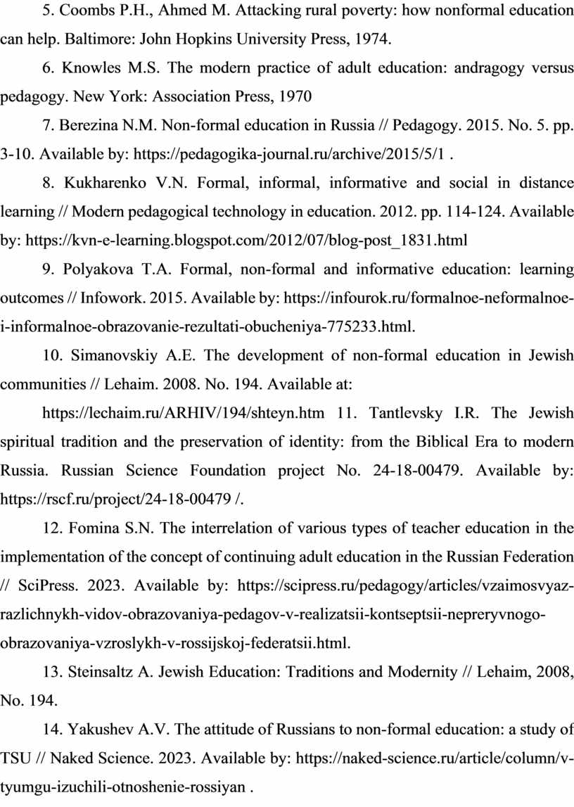 7. Березина Н.М. Неформальное образование в России // Педагогика. 2015. № 5. С. 3–10. Доступно по: https://pedagogika-journal.ru/archive/2015/5/1.