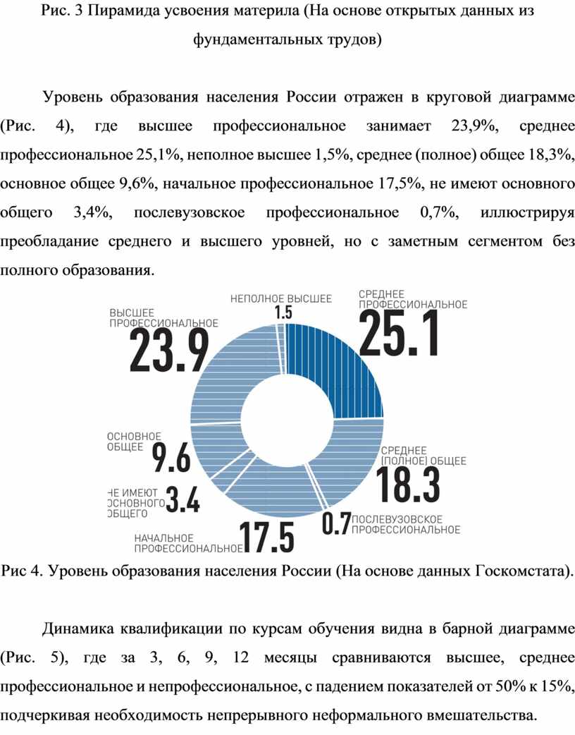 Уровень образования населения России отражен в круговой диаграмме (Рис. 4), где высшее профессиональное занимает 23,9%, среднее профессиональное 25,1%, неполное высшее 1,5%, среднее (полное) общее 18,3%, основное общее 9,6%, начальное профессиональное 17,5%, не имеют основного общего 3,4%, послевузовское профессиональное 0,7%, иллюстрируя преобладание среднего и высшего уровней, но с заметным сегментом без полного образования.