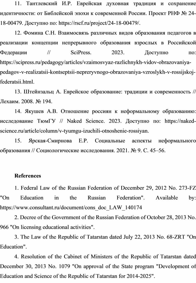 14. Якушев А.В. Отношение россиян к неформальному образованию: исследование ТюмГУ // Naked Science. 2023. Доступно по: https://naked-science.ru/article/column/v-tyumgu-izuchili-otnoshenie-rossiyan.