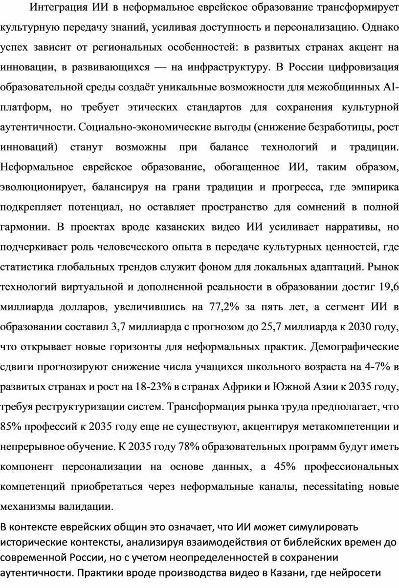 Интеграция ИИ в неформальное еврейское образование трансформирует культурную передачу знаний, усиливая доступность и персонализацию. Однако успех зависит от региональных особенностей: в развитых странах акцент на инновации, в развивающихся — на инфраструктуру. В России цифровизация образовательной среды создаёт уникальные возможности для межобщинных AI-платформ, но требует этических стандартов для сохранения культурной аутентичности. Социально-экономические выгоды (снижение безработицы, рост инноваций) станут возможны при балансе технологий и традиции. Неформальное еврейское образование, обогащенное ИИ, таким образом, эволюционирует, балансируя на грани традиции и прогресса, где эмпирика подкрепляет потенциал, но оставляет пространство для сомнений в полной гармонии. В проектах вроде казанских видео ИИ усиливает нарративы, но подчеркивает роль человеческого опыта в передаче культурных ценностей, где статистика глобальных трендов служит фоном для локальных адаптаций. Рынок технологий виртуальной и дополненной реальности в образовании достиг 19,6 миллиарда долларов, увеличившись на 77,2% за пять лет, а сегмент ИИ в образовании составил 3,7 миллиарда с прогнозом до 25,7 миллиарда к 2030 году, что открывает новые горизонты для неформальных практик. Демографические сдвиги прогнозируют снижение числа учащихся школьного возраста на 4-7% в развитых странах и рост на 18-23% в странах Африки и Южной Азии к 2035 году, требуя реструктуризации систем. Трансформация рынка труда предполагает, что 85% профессий к 2035 году еще не существуют, акцентируя метакомпетенции и непрерывное обучение. К 2035 году 78% образовательных программ будут иметь компонент персонализации на основе данных, а 45% профессиональных компетенций приобретаться через неформальные каналы, necessitating новые механизмы валидации.