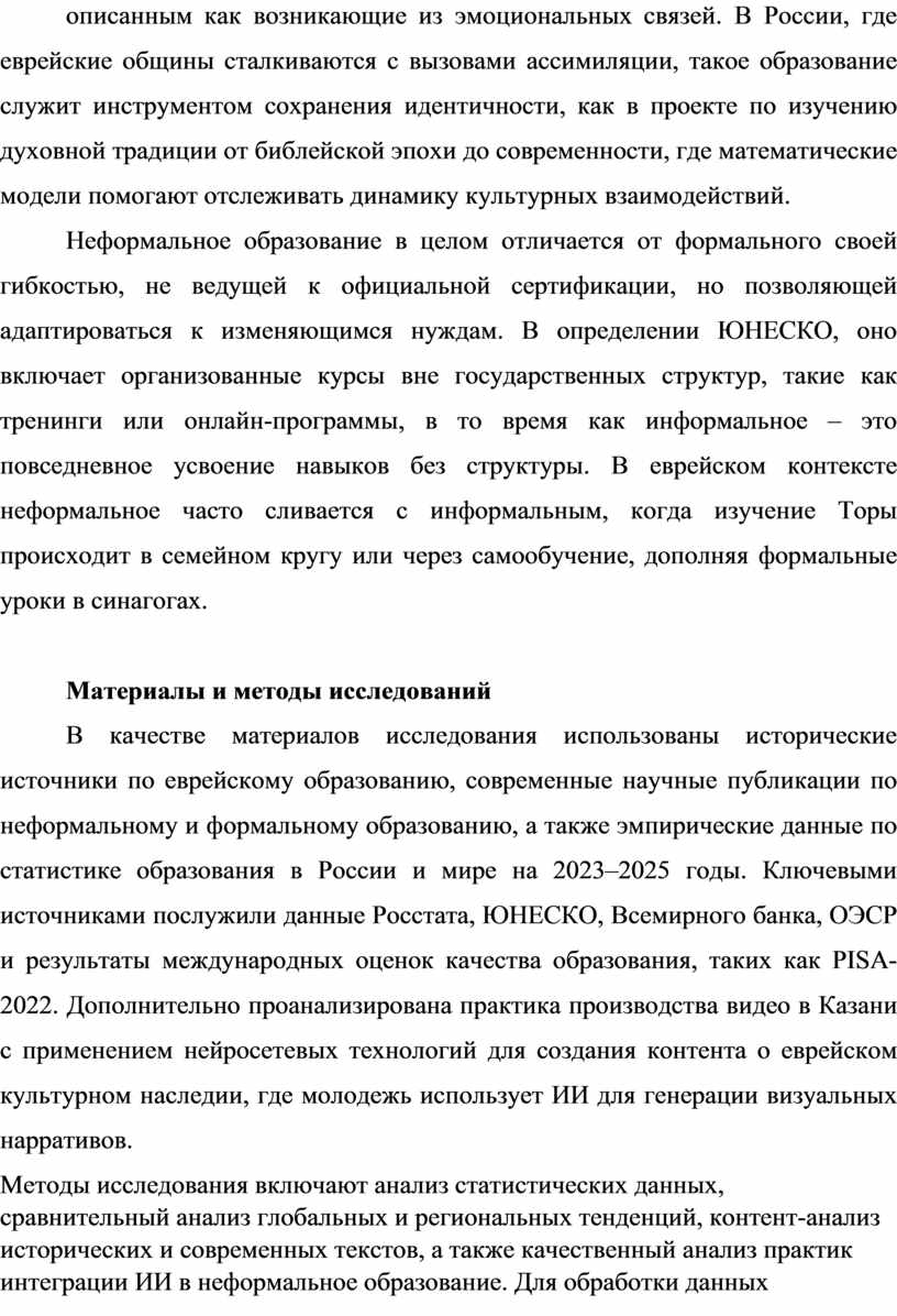 В качестве материалов исследования использованы исторические источники по еврейскому образованию, современные научные публикации по неформальному и формальному образованию, а также эмпирические данные по статистике образования в России и мире на 2023–2025 годы. Ключевыми источниками послужили данные Росстата, ЮНЕСКО, Всемирного банка, ОЭСР и результаты международных оценок качества образования, таких как PISA-2022. Дополнительно проанализирована практика производства видео в Казани с применением нейросетевых технологий для создания контента о еврейском культурном наследии, где молодежь использует ИИ для генерации визуальных нарративов.