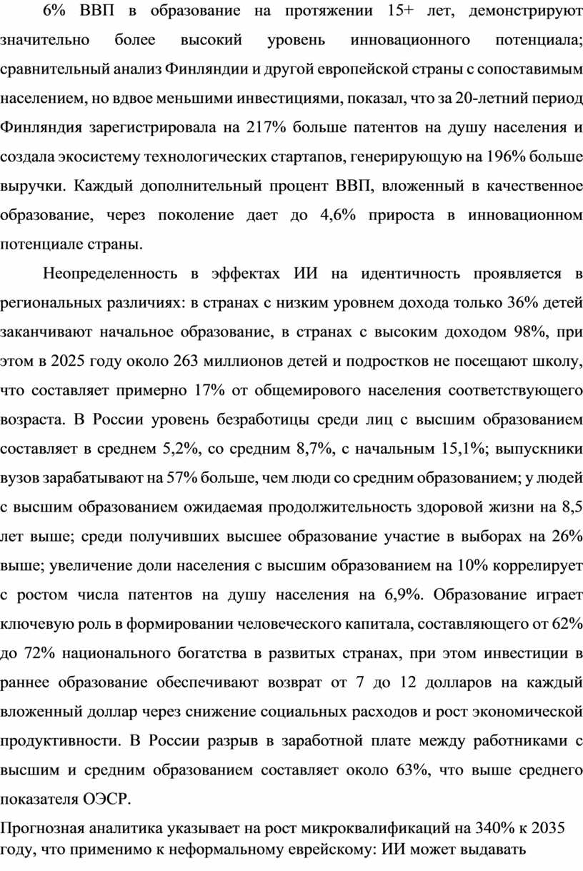 Неопределенность в эффектах ИИ на идентичность проявляется в региональных различиях: в странах с низким уровнем дохода только 36% детей заканчивают начальное образование, в странах с высоким доходом 98%, при этом в 2025 году около 263 миллионов детей и подростков не посещают школу, что составляет примерно 17% от общемирового населения соответствующего возраста. В России уровень безработицы среди лиц с высшим образованием составляет в среднем 5,2%, со средним 8,7%, с начальным 15,1%; выпускники вузов зарабатывают на 57% больше, чем люди со средним образованием; у людей с высшим образованием ожидаемая продолжительность здоровой жизни на 8,5 лет выше; среди получивших высшее образование участие в выборах на 26% выше; увеличение доли населения с высшим образованием на 10% коррелирует с ростом числа патентов на душу населения на 6,9%. Образование играет ключевую роль в формировании человеческого капитала, составляющего от 62% до 72% национального богатства в развитых странах, при этом инвестиции в раннее образование обеспечивают возврат от 7 до 12 долларов на каждый вложенный доллар через снижение социальных расходов и рост экономической продуктивности. В России разрыв в заработной плате между работниками с высшим и средним образованием составляет около 63%, что выше среднего показателя ОЭСР.