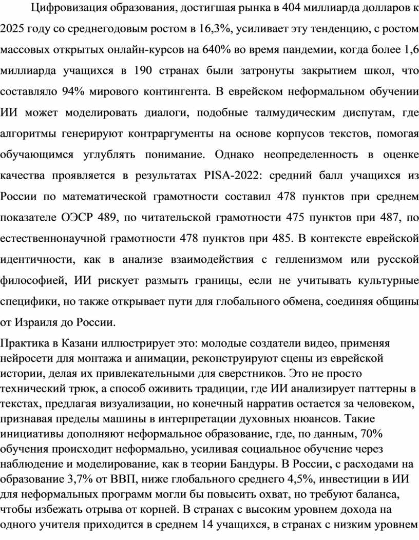 Цифровизация образования, достигшая рынка в 404 миллиарда долларов к 2025 году со среднегодовым ростом в 16,3%, усиливает эту тенденцию, с ростом массовых открытых онлайн-курсов на 640% во время пандемии, когда более 1,6 миллиарда учащихся в 190 странах были затронуты закрытием школ, что составляло 94% мирового контингента. В еврейском неформальном обучении ИИ может моделировать диалоги, подобные талмудическим диспутам, где алгоритмы генерируют контраргументы на основе корпусов текстов, помогая обучающимся углублять понимание. Однако неопределенность в оценке качества проявляется в результатах PISA-2022: средний балл учащихся из России по математической грамотности составил 478 пунктов при среднем показателе ОЭСР 489, по читательской грамотности 475 пунктов при 487, по естественнонаучной грамотности 478 пунктов при 485. В контексте еврейской идентичности, как в анализе взаимодействия с гелленизмом или русской философией, ИИ рискует размыть границы, если не учитывать культурные специфики, но также открывает пути для глобального обмена, соединяя общины от Израиля до России.