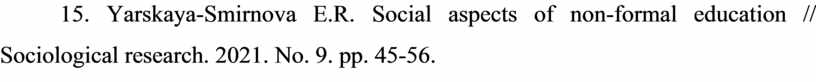 15. Yarskaya-Smirnova E.R. Social aspects of non-formal education // Sociological research. 2021. No. 9. pp. 45-56.