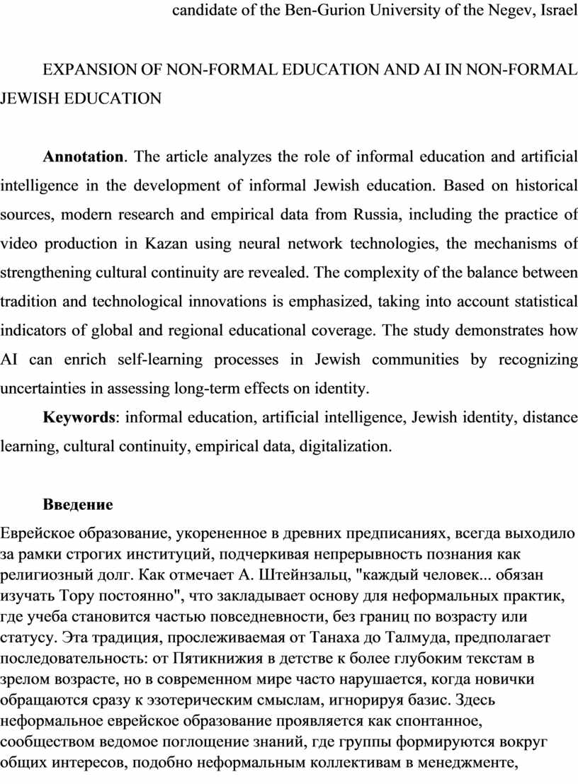 Ключевые слова: неформальное образование, искусственный интеллект, еврейская идентичность, дистанционное обучение, культурная преемственность, эмпирические данные, цифровизация.