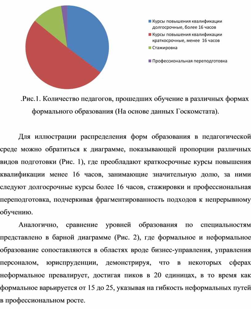 Для иллюстрации распределения форм образования в педагогической среде можно обратиться к диаграмме, показывающей пропорции различных видов подготовки (Рис. 1), где преобладают краткосрочные курсы повышения квалификации менее 16 часов, занимающие значительную долю, за ними следуют долгосрочные курсы более 16 часов, стажировки и профессиональная переподготовка, подчеркивая фрагментированность подходов к непрерывному обучению.