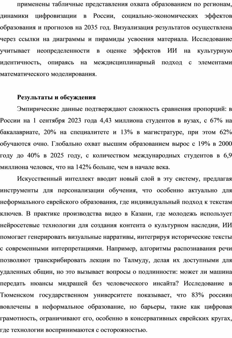 Методы исследования включают анализ статистических данных, сравнительный анализ глобальных и региональных тенденций, контент-анализ исторических и современных текстов, а также качественный анализ практик интеграции ИИ в неформальное образование. Для обработки данных применены табличные представления охвата образованием по регионам, динамики цифровизации в России, социально-экономических эффектов образования и прогнозов на 2035 год. Визуализация результатов осуществлена через ссылки на диаграммы и пирамиды усвоения материала. Исследование учитывает неопределенности в оценке эффектов ИИ на культурную идентичность, опираясь на междисциплинарный подход с элементами математического моделирования.