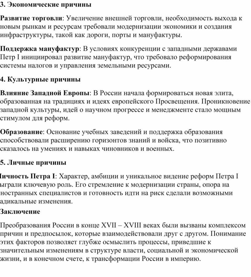 Преобразования России в конце XVII – XVIII веках были вызваны комплексом причин и предпосылок, которые взаимодействовали друг с другом. Понимание этих факторов позволяет глубже осмыслить процессы, приведшие к значительным изменениям в структуре власти, социальной и экономической жизни, и в конечном счете, к трансформации России в империю.