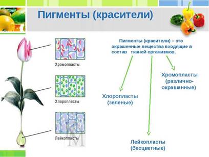 Окраску различным органам растений придают особые вещества – пигменты. Это органические соединения, присутствующие в клетках и тканях растений и окрашивающие их. Расположены пигменты в пластидах клетки – хлоропластах и хромопластах, некоторые находятся в клеточном соке растений.