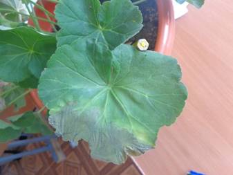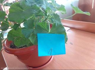 Ход опыта. Для опыта я взяла растение – пеларгонию (герань). Одну половину листовой пластинки закрыла черной бумагой, другую листовую пластину закрыла синей бумагой. Растение поставила в хорошо освещенное место. Спустя 6-7 дней сняла бумагу, сравнила цвет половинок листа. Там где лист был закрыт синей бумагой ничего не изменилось, а там где лист был закрыт черной бумагой хорошо заметны различия в окраске: освещенная часть зеленая, а затемненная – желтая, сухая.