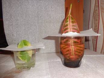 Ход опыта: Стареющий, но еще сохранивший зеленый цвет лист любого светолюбивого растения (для опыта мы взяли лист кротона) опустила в стакан с водой так, чтобы только половина листа его находилась под водой. Для этого закрепила лист в прорези укрывающей стакан плотной бумаги. Стакан поставила в темное место. Через 3 - 5 дней стали заметны различия в окраске листа: находившаяся в воде часть сохранила зеленый цвет, другая часть, находящаяся в воздухе - пожелтела.