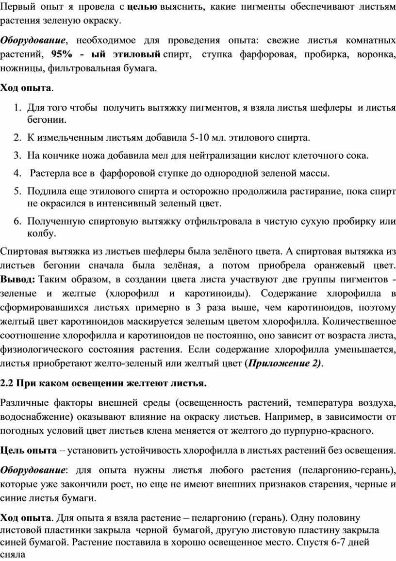 Вывод: Результаты опыта свидетельствуют, что снижение интенсивности и продолжительности освещения листьев ускоряет распад молекул хлорофилла в хлоропластах (Приложение 3).