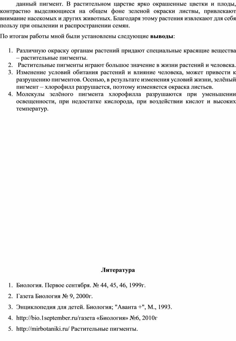Исследовав вопрос о растительных пигментах, я узнала, что пигменты играют очень значительную роль в природе и имеют огромное значение для жизни на Земле. Многие природные пигменты используются человеком в его хозяйственной деятельности. Особенно детально изучено значение хлорофилла и других пигментов в фотосинтезе. Во многих случаях, однако, единственной известной функцией пигмента является то, что он придает окраску организму или той его части, которая содержит данный пигмент. В растительном царстве ярко окрашенные цветки и плоды, контрастно выделяющиеся на общем фоне зеленой окраски листвы, привлекают внимание насекомых и других животных. Благодаря этому растения извлекают для себя пользу при опылении и распространении семян.