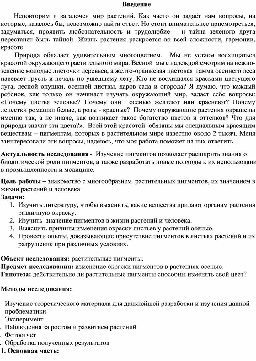 Объект исследования: растительные пигменты. Предмет исследования: изменение окраски пигментов в растениях осенью. Гипотеза: действительно ли растительные пигменты способны изменять свой цвет?