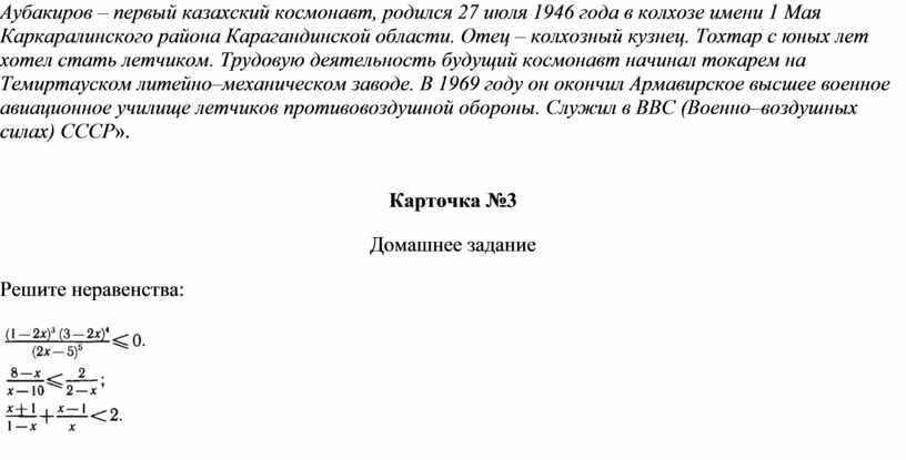 Для справки. «Первый казахский космонавт, Герой Советского Союза Тохтар Аубакиров 2 октября 1991г. открыл космическую страницу суверенного и независимого Казахстана. Тохтар Онгарбаевич Аубакиров – первый казахский космонавт, родился 27 июля 1946 года в колхозе имени 1 Мая Каркаралинского района Карагандинской области. Отец – колхозный кузнец. Тохтар с юных лет хотел стать летчиком. Трудовую деятельность будущий космонавт начинал токарем на Темиртауском литейно–механическом заводе. В 1969 году он окончил Армавирское высшее военное авиационное училище летчиков противовоздушной обороны. Служил в ВВС (Военно–воздушных силах) СССР».