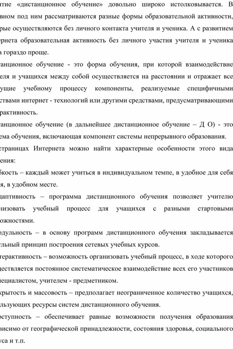 Дистанционное обучение - это форма обучения, при которой взаимодействие учителя и учащихся между собой осуществляется на расстоянии и отражает все присущие учебному процессу компоненты, реализуемые специфичными средствами интернет - технологий или другими средствами, предусматривающими интерактивность.
