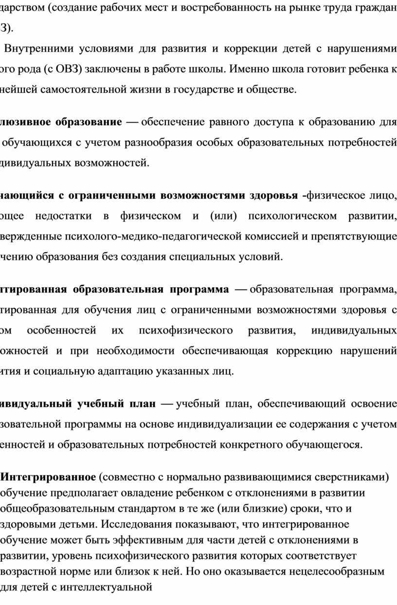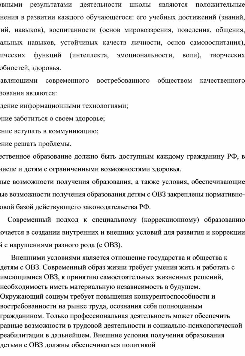 Внутренними условиями для развития и коррекции детей с нарушениями разного рода (с ОВЗ) заключены в работе школы. Именно школа готовит ребенка к дальнейшей самостоятельной жизни в государстве и обществе.