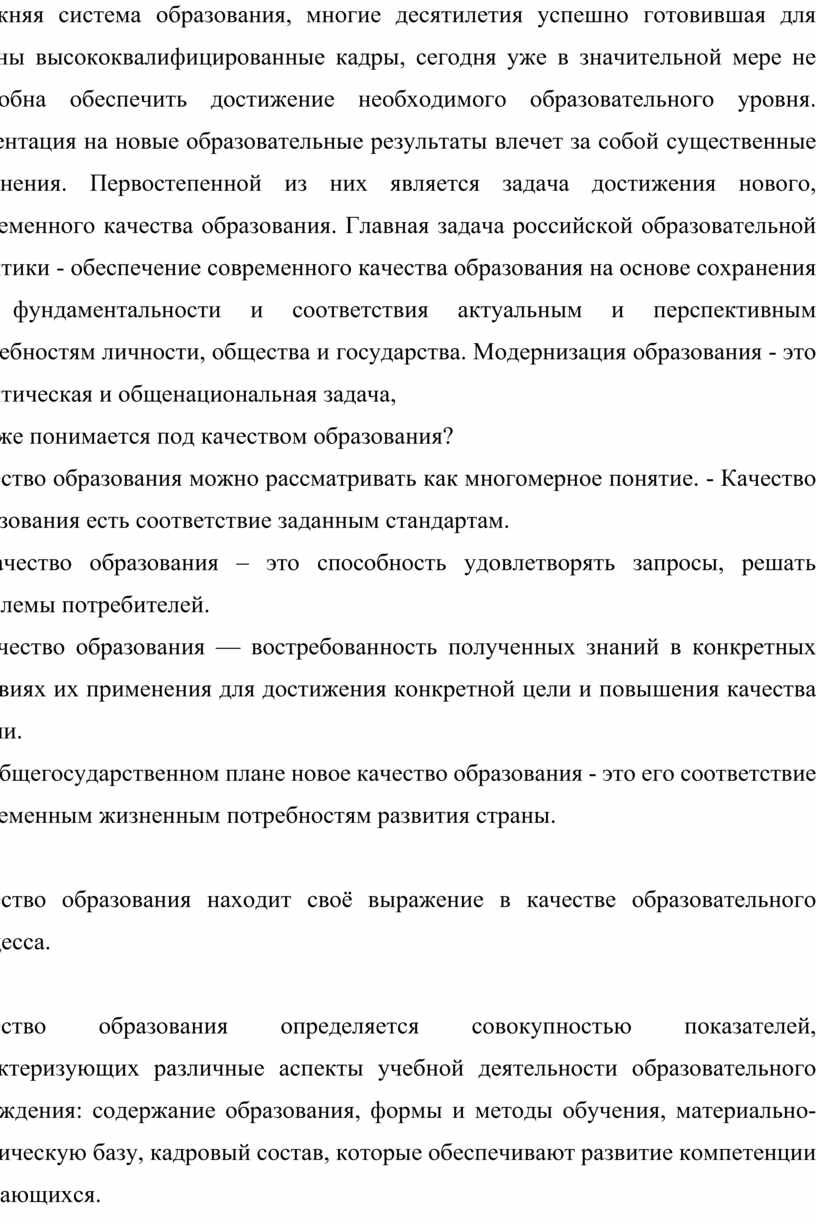 Качество образования определяется совокупностью показателей, характеризующих различные аспекты учебной деятельности образовательного учреждения: содержание образования, формы и методы обучения, материально- техническую базу, кадровый состав, которые обеспечивают развитие компетенции обучающихся.