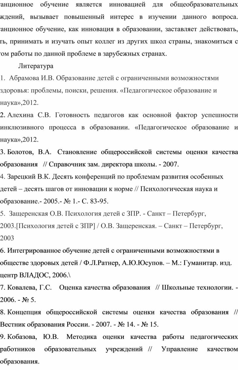 1. Абрамова И.В. Образование детей с ограниченными возможностями здоровья: проблемы, поиски, решения. «Педагогическое образование и наука»,2012.