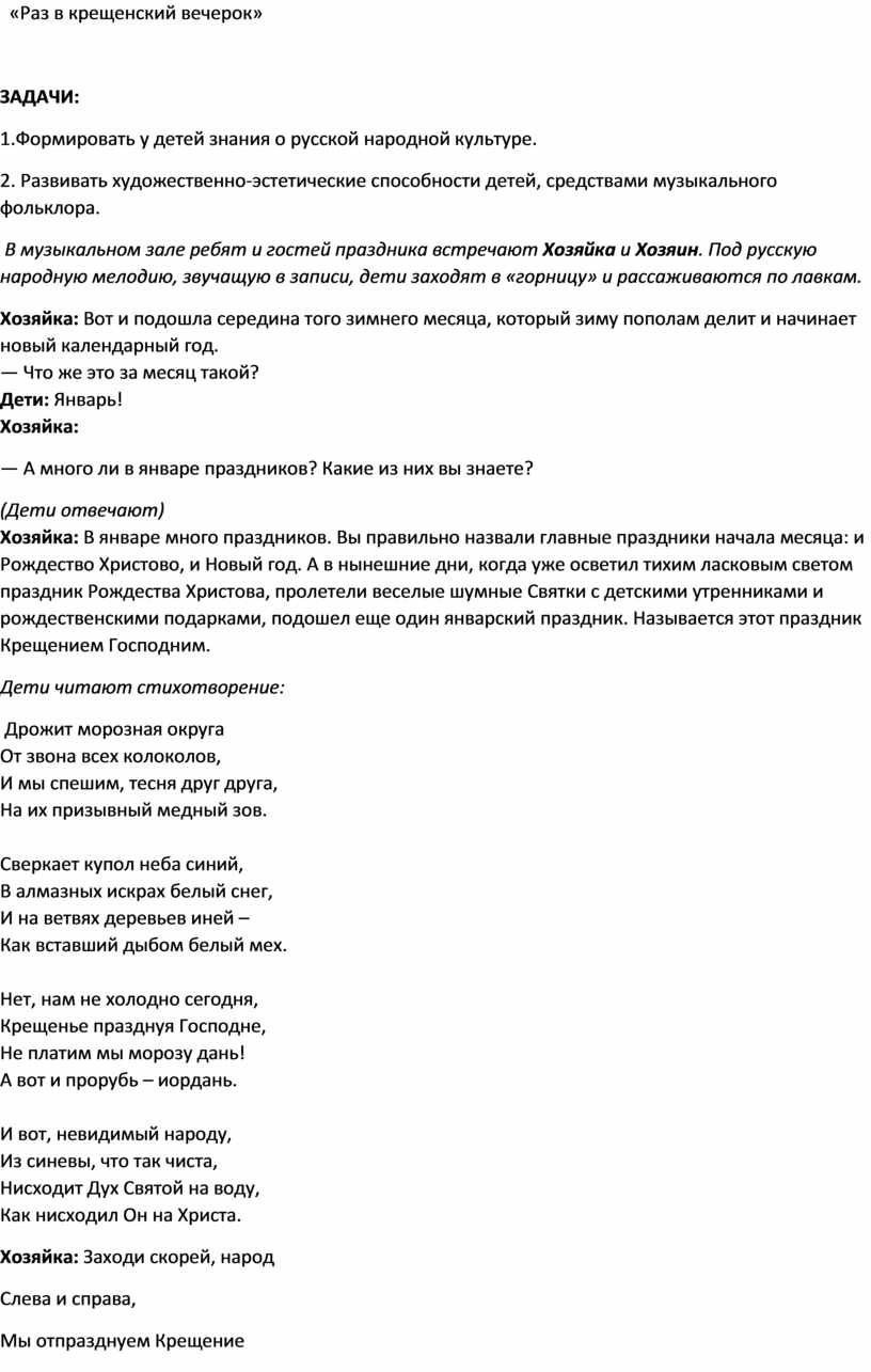 Хозяйка: Собрались мы в нашей горнице, чтобы побеседовать о православном народном празднике, который завершает череду святочных вечеров, о Крещении.