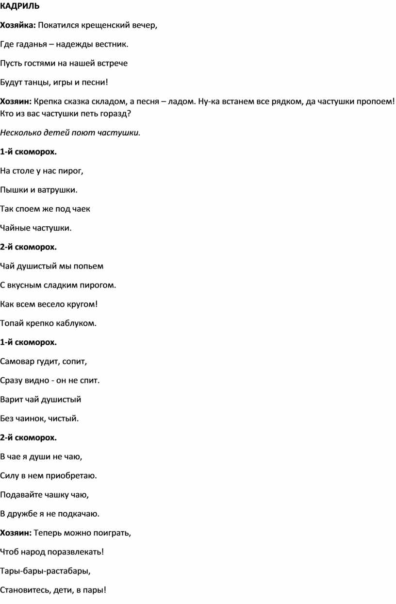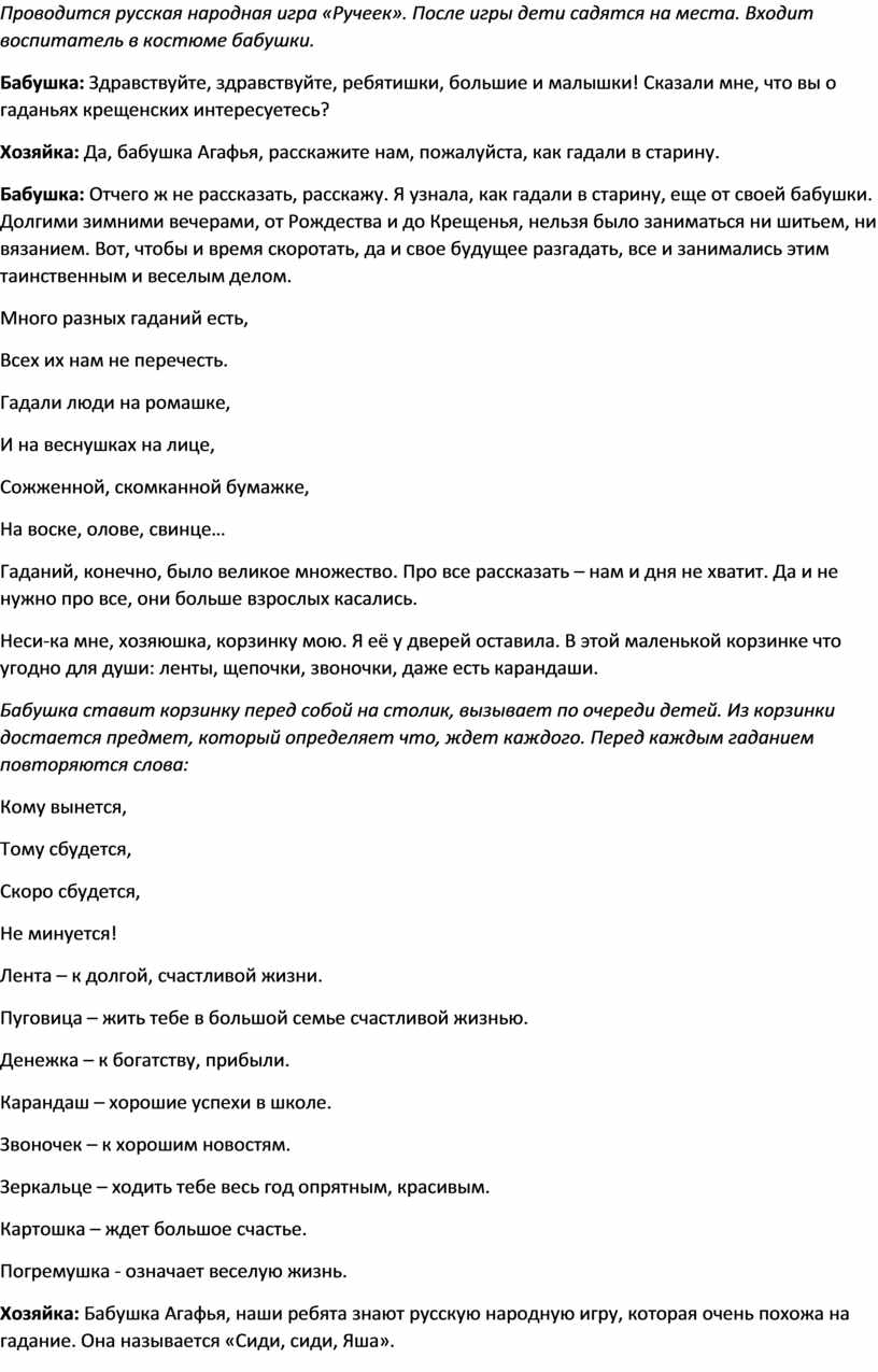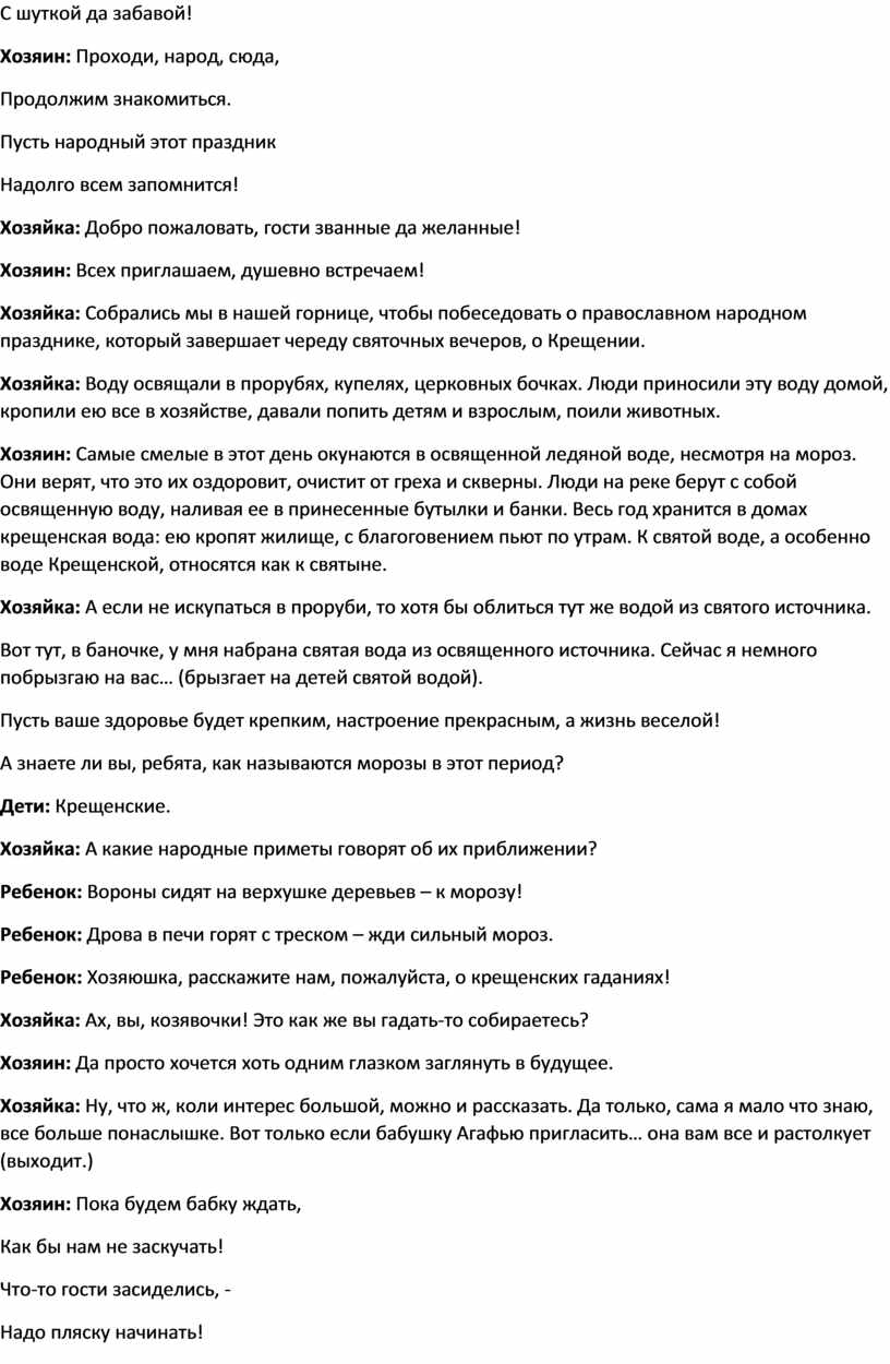 Бабушка: Здравствуйте, здравствуйте, ребятишки, большие и малышки! Сказали мне, что вы о гаданьях крещенских интересуетесь?
