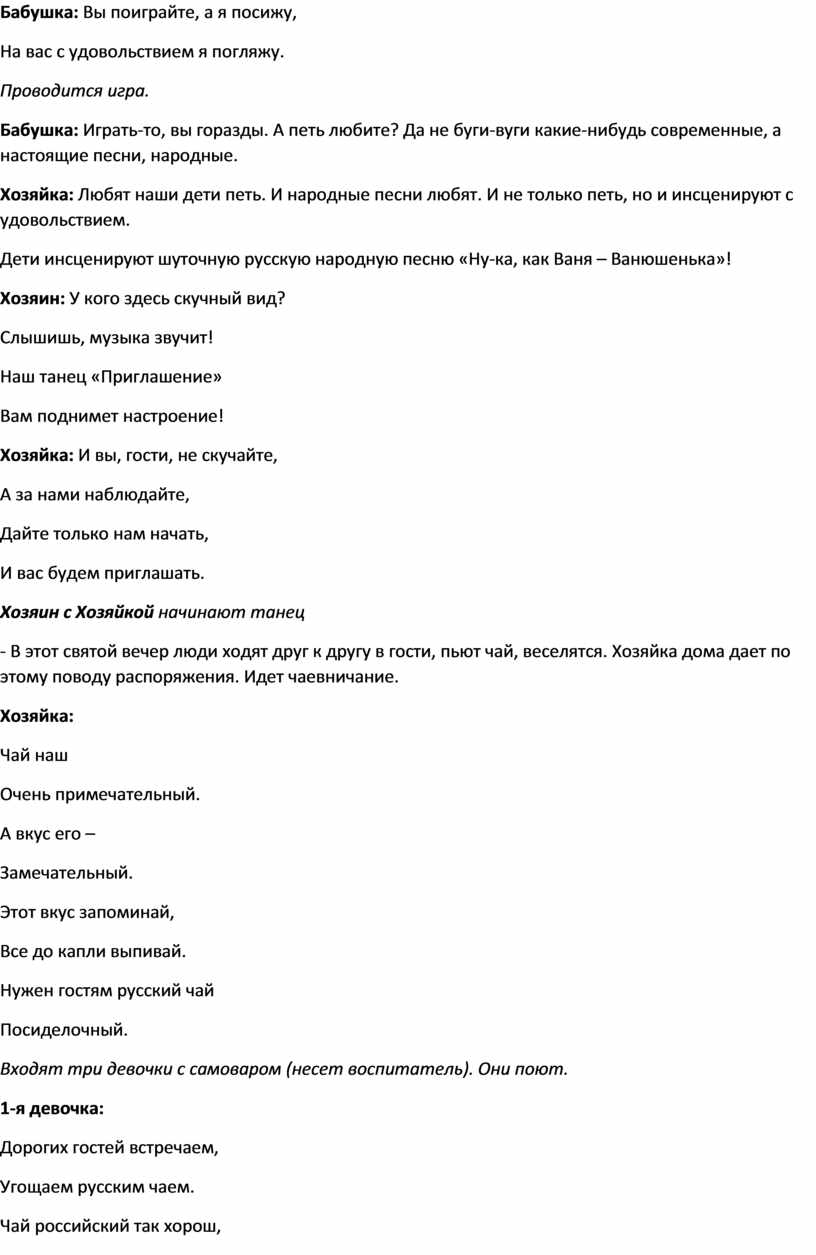 - В этот святой вечер люди ходят друг к другу в гости, пьют чай, веселятся. Хозяйка дома дает по этому поводу распоряжения. Идет чаевничание.