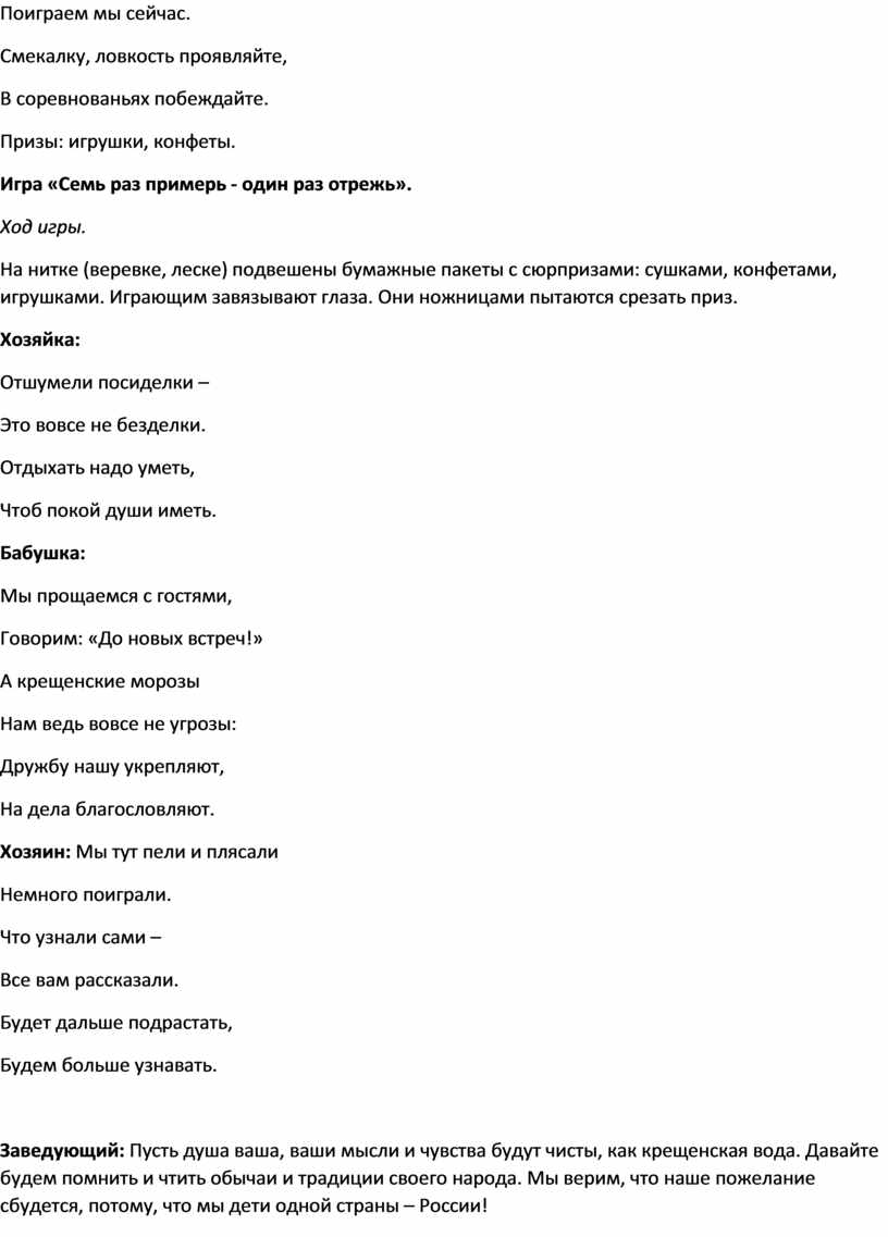 Заведующий: Пусть душа ваша, ваши мысли и чувства будут чисты, как крещенская вода. Давайте будем помнить и чтить обычаи и традиции своего народа. Мы верим, что наше пожелание сбудется, потому, что мы дети одной страны – России!
