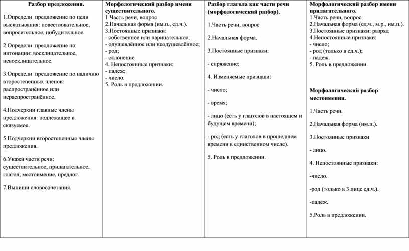 Разбор предложения. 1.Определи предложение по цели высказывания: повествовательное, вопросительное, побудительное. 2.Определи предложение по интонации: восклицательное, невосклицательное. 3.Определи предложение по наличию второстепенных членов: распространённое или нераспространённое. 4.Подчеркни главные члены предложения: подлежащее и сказуемое. 5.Подчеркни второстепенные члены предложения. 6.Укажи части речи: существительное, прилагательное, глагол, местоимение, предлог. 7.Выпиши словосочетания.