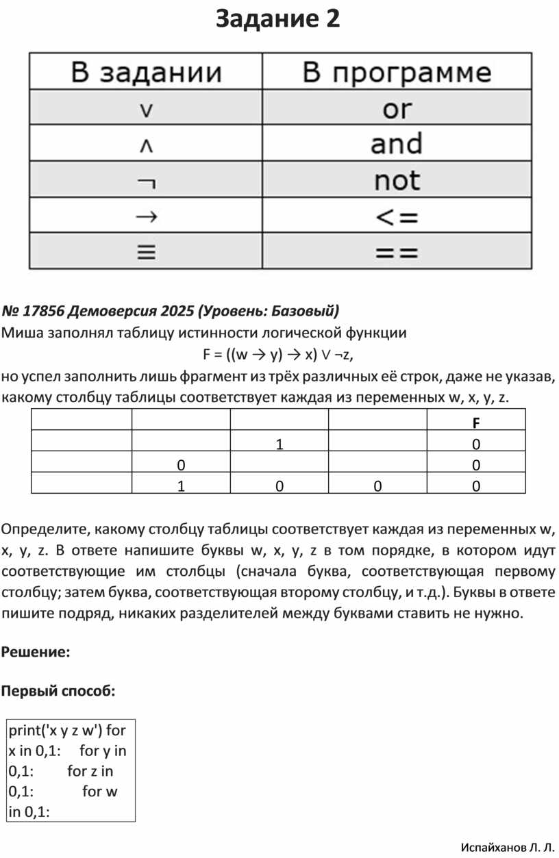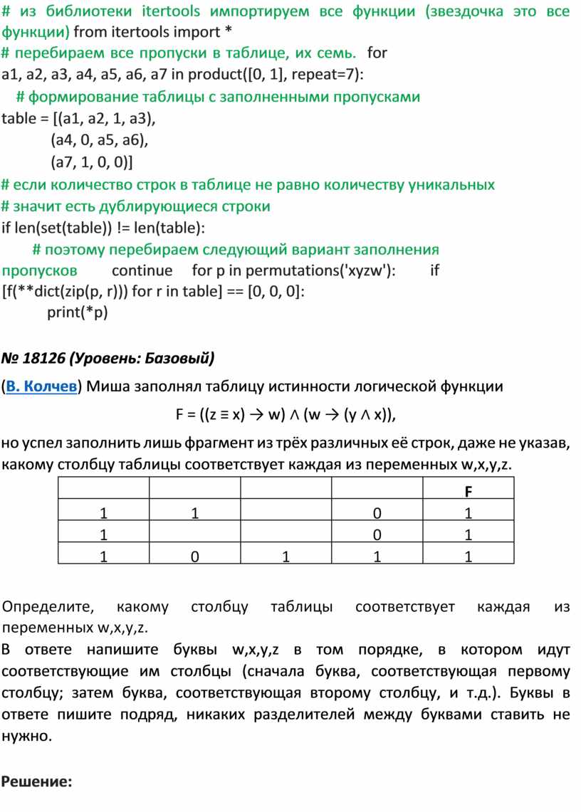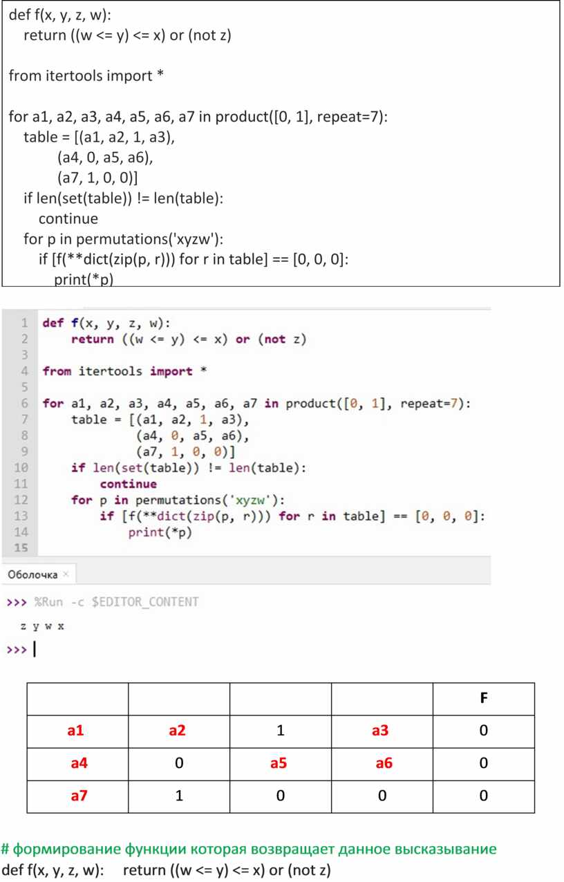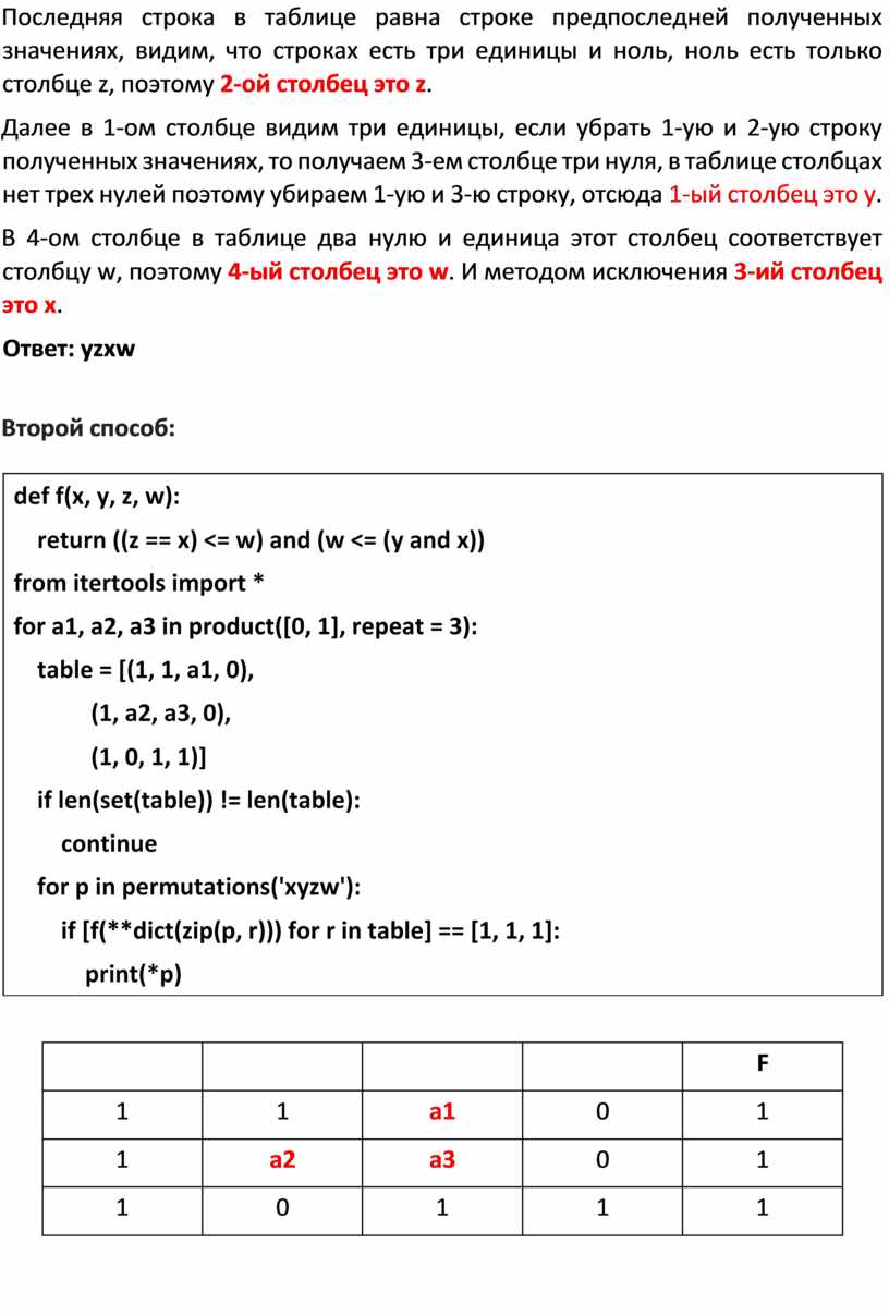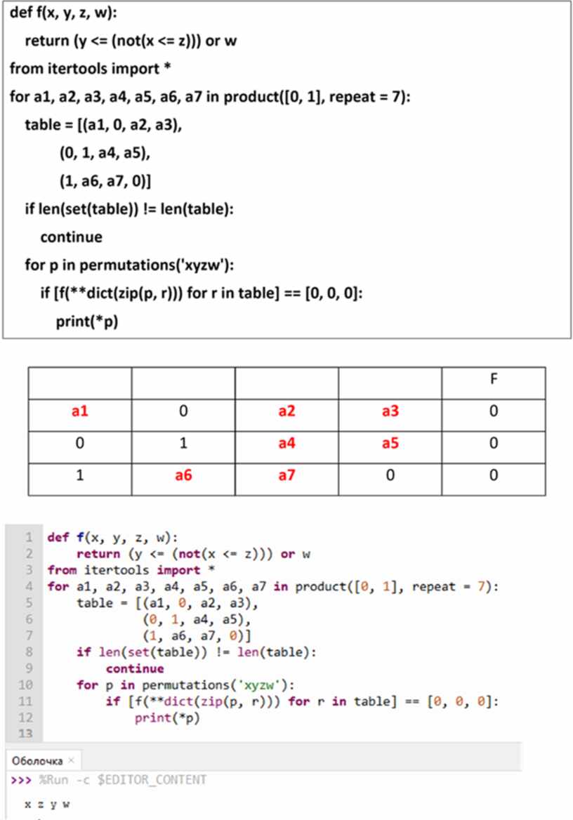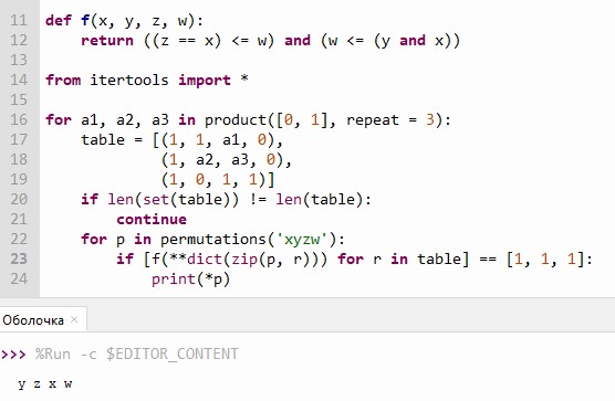 # поэтому перебираем следующий вариант заполнения пропусков continue for p in permutations('xyzw'): if [f(**dict(zip(p, r))) for r in table] == [0, 0, 0]: