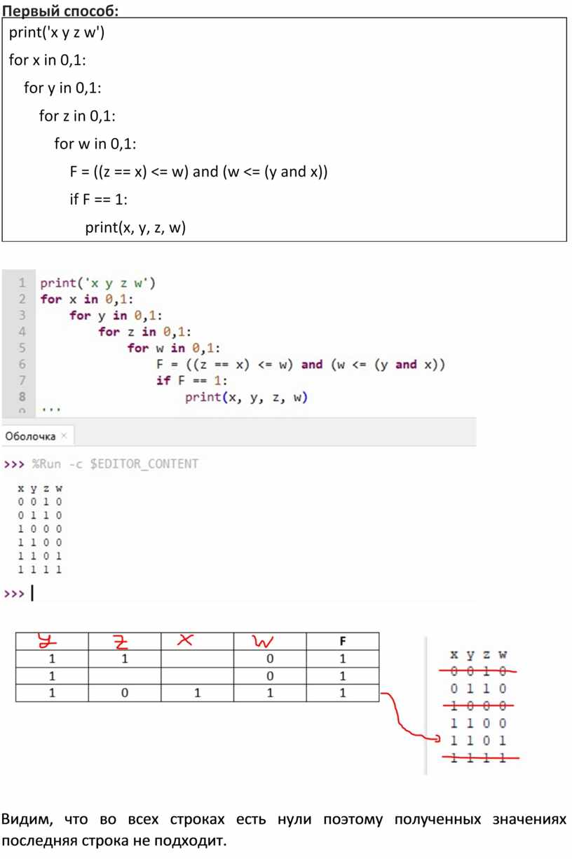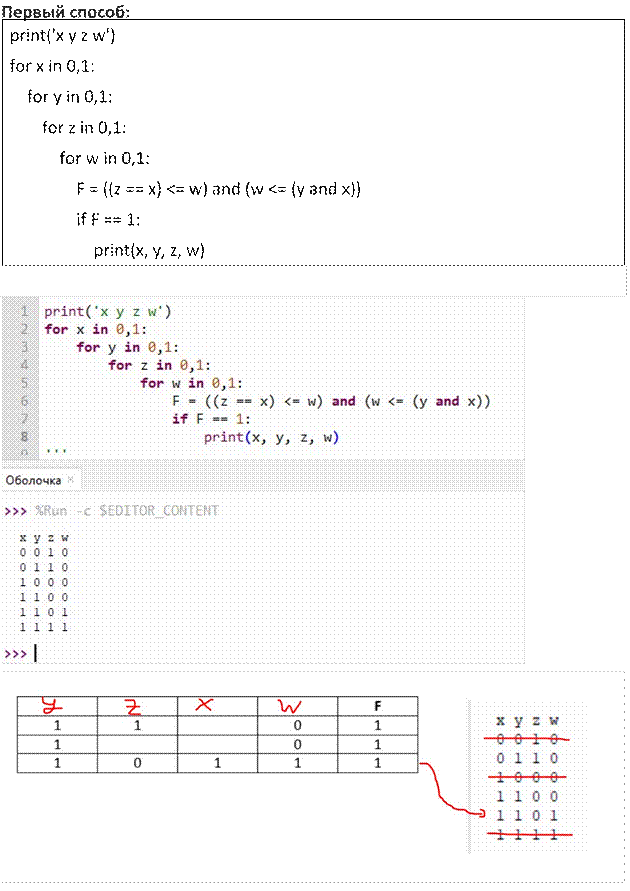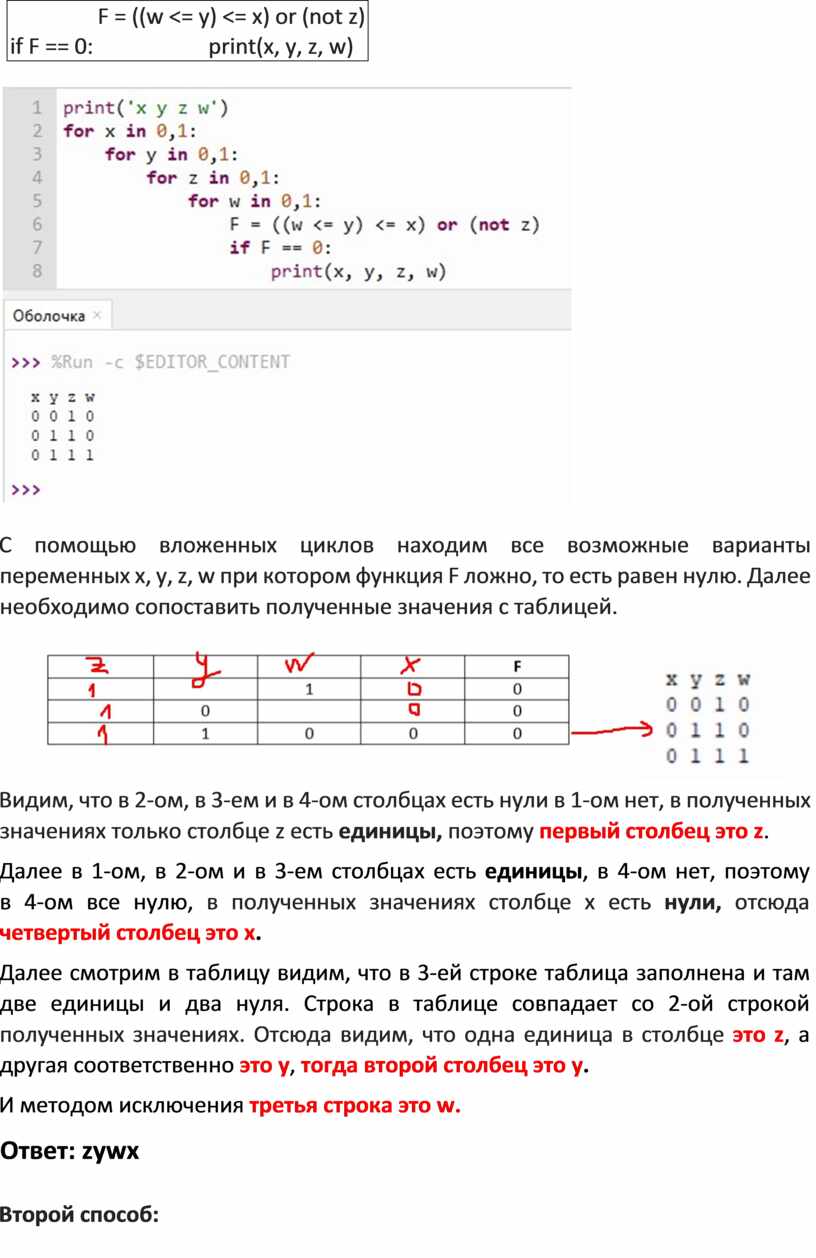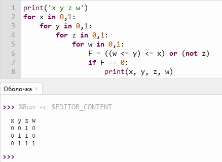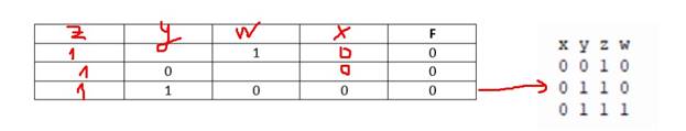 С помощью вложенных циклов находим все возможные варианты переменных x, y, z, w при котором функция F ложно, то есть равен нулю. Далее необходимо сопоставить полученные значения с таблицей.
