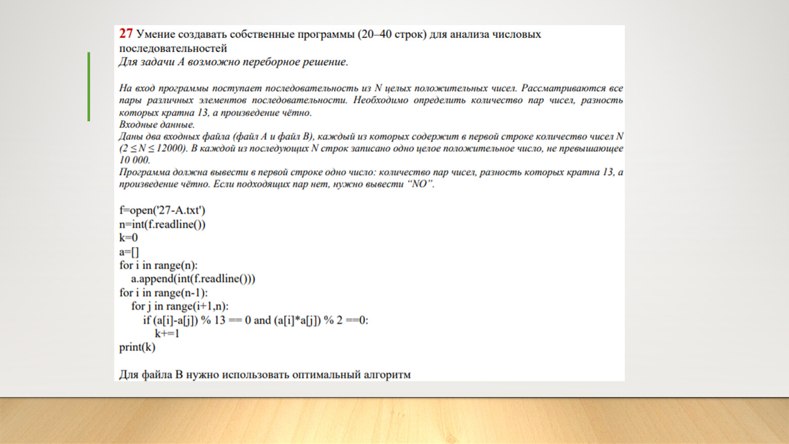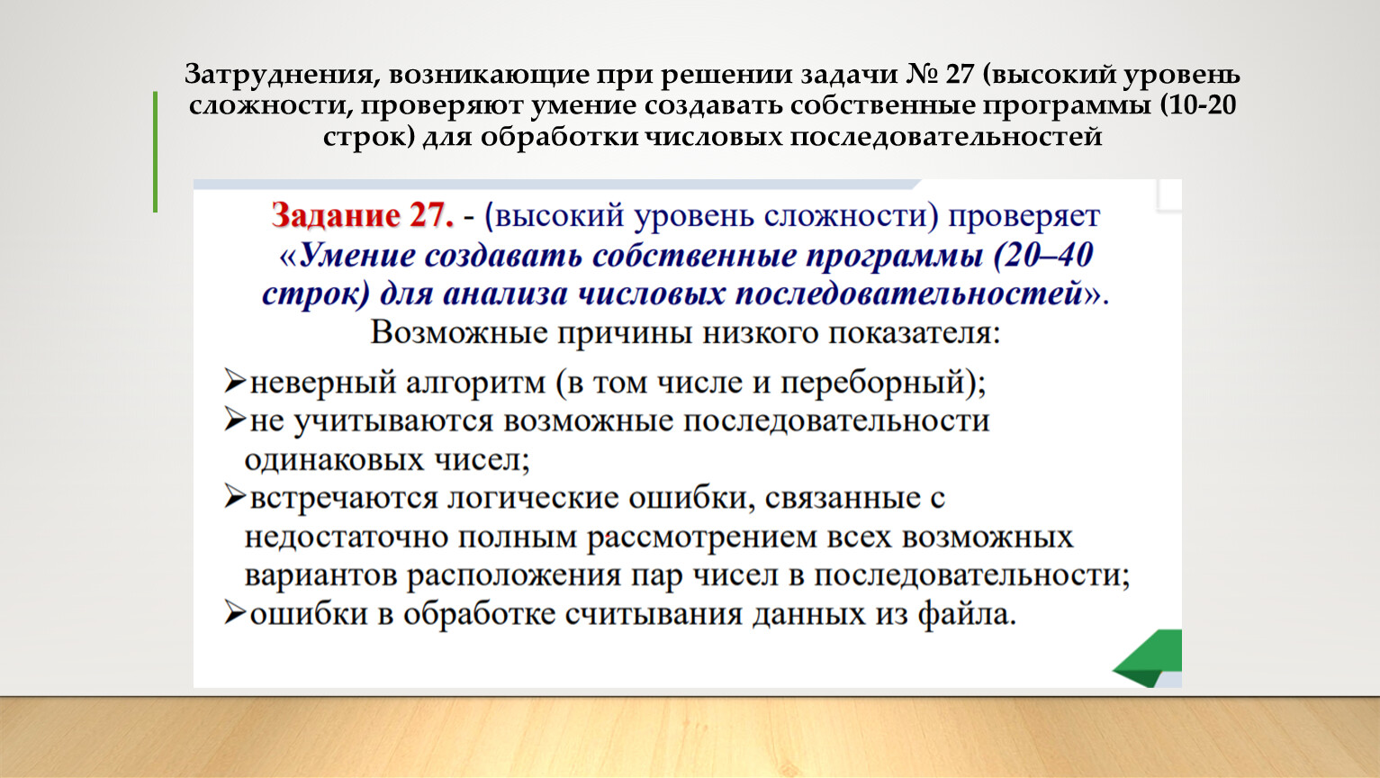 Затруднения, возникающие при решении задачи № 27 (высокий уровень сложности, проверяют умение создавать собственные программы (10-20 строк) для обработки числовых последовательностей