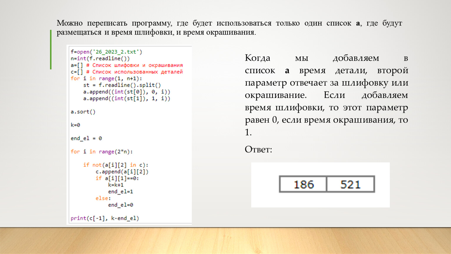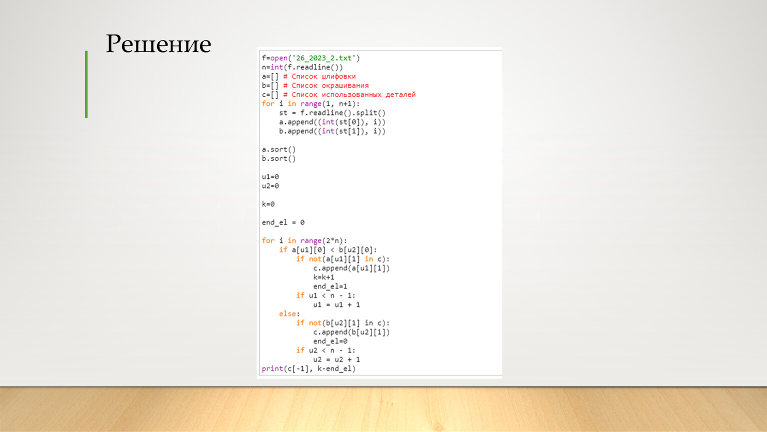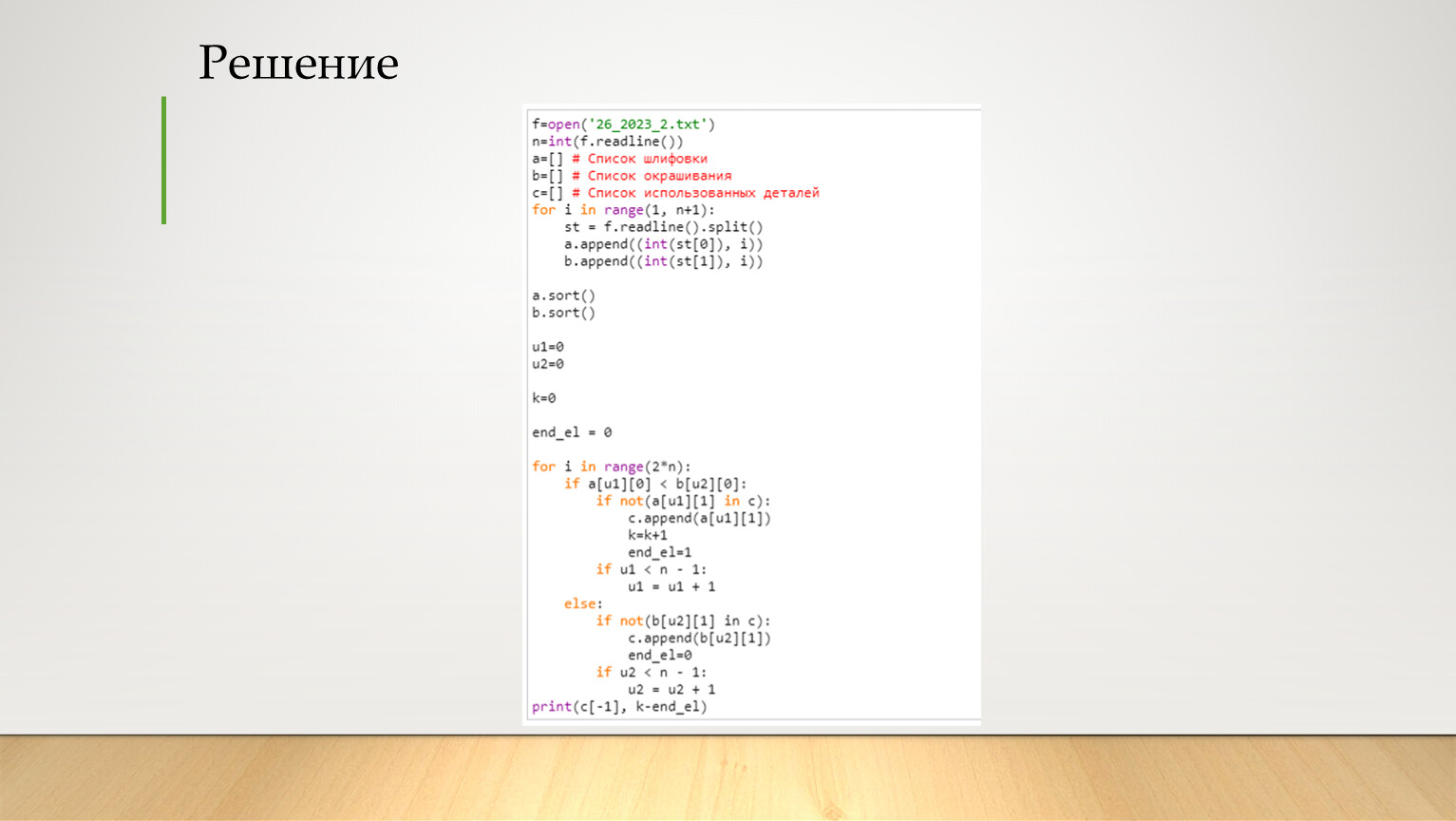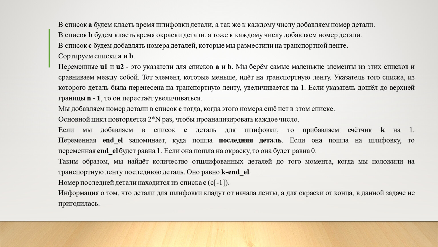 1) Для N деталей имеется 2N чисел, которые обозначают время окрашивания и время шлифовки каждой детали. Эти 2N чисел сортируются по возрастанию.