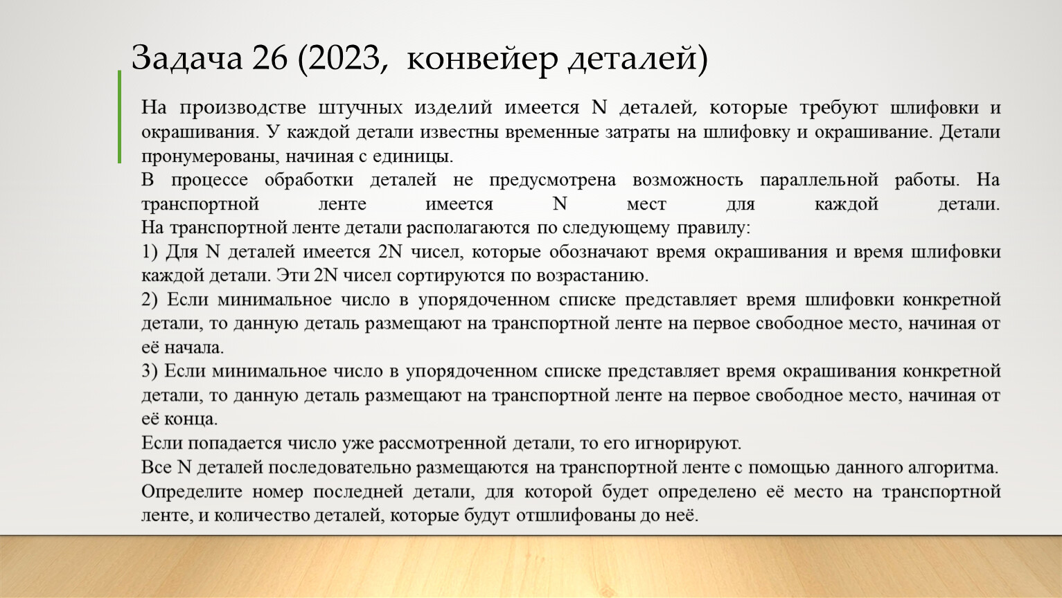 Информация о том, что детали для шлифовки кладут от начала ленты, а для окраски от конца, в данной задаче не пригодилась.