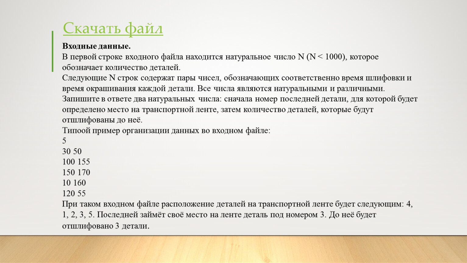 На производстве штучных изделий имеется N деталей, которые требуют шлифовки и окрашивания. У каждой детали известны временные затраты на шлифовку и окрашивание. Детали пронумерованы, начиная с единицы.