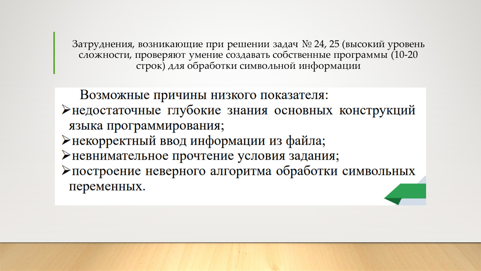 Затруднения, возникающие при решении задач № 24, 25 (высокий уровень сложности, проверяют умение создавать собственные программы (10-20 строк) для обработки символьной информации
