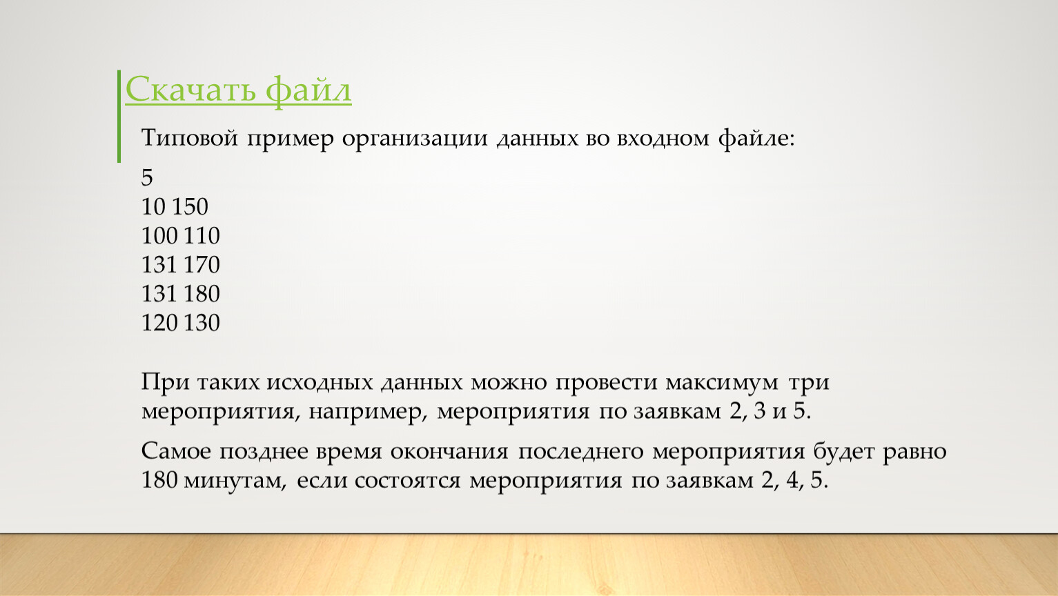 Входные данныеВ первой строке входного файла находится натуральное число N (N < 1000) - количество заявок. Следующие N строк содержат пары чисел, обозначающих время начала и время окончания мероприятий. Числа натуральные, не превышающие 1440.