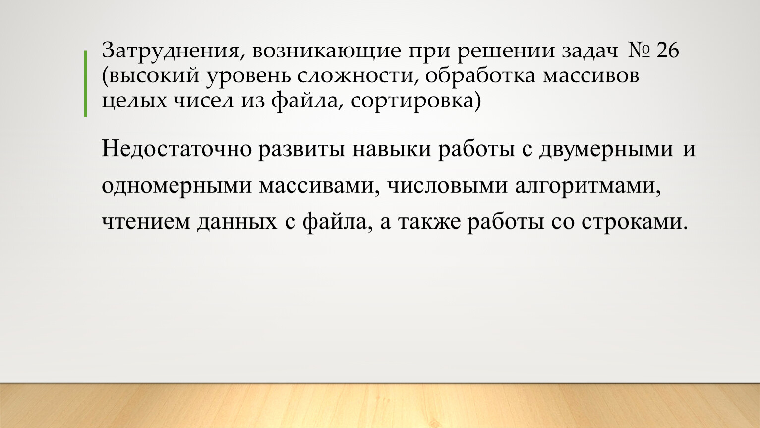 Затруднения, возникающие при решении задач № 26 (высокий уровень сложности, обработка массивов целых чисел из файла, сортировка)